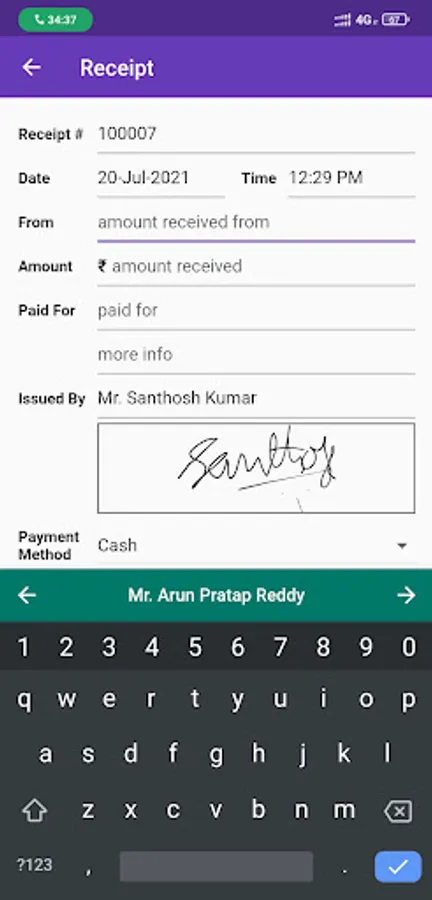 This app has linguistic intelligence for Received from & Paid for. This app keeps track of Received from, Paid for & intelligently suggests as and when you type.