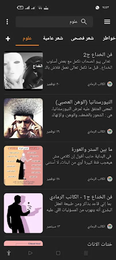 كما انه يحتوي على الكثير من نصوصي ومواضيع علمية وتاريخية من كتاباتي الخاصة والكثير من القصص والروايات التيريتم اضافتها بشكل يومي من وحيخيالي انا وأصدقاء من كتاب "كيان وجد"