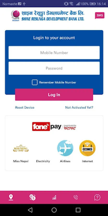 To be able to use this App, you first need to have a valid account maintained at Shine Resunga Development Bank, and you need to subscribe to the Shine Resunga Development Bank's Mobile Banking Service.