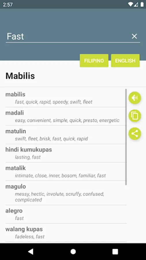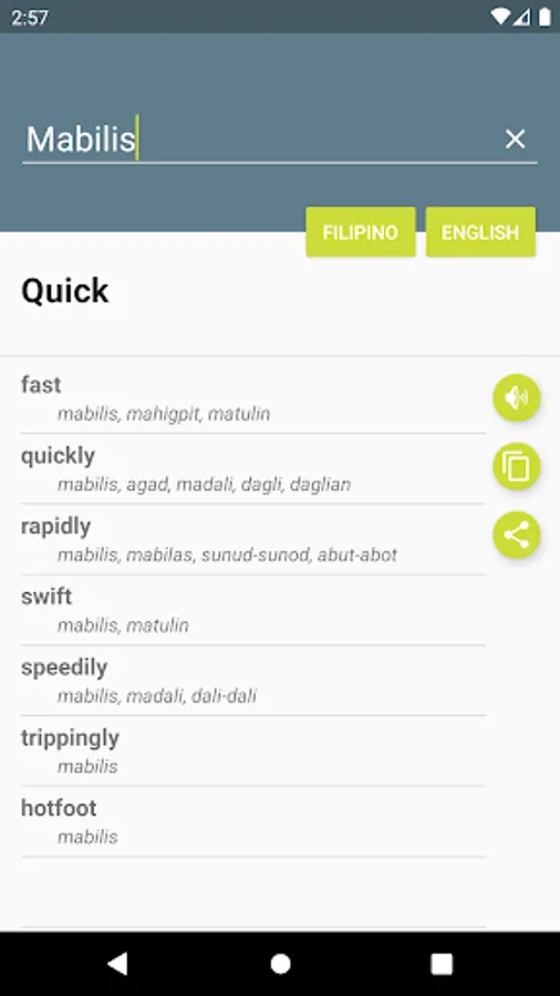 With the Filipino-English Dictionary you get instant access to a large database of words that are constantly expanding.