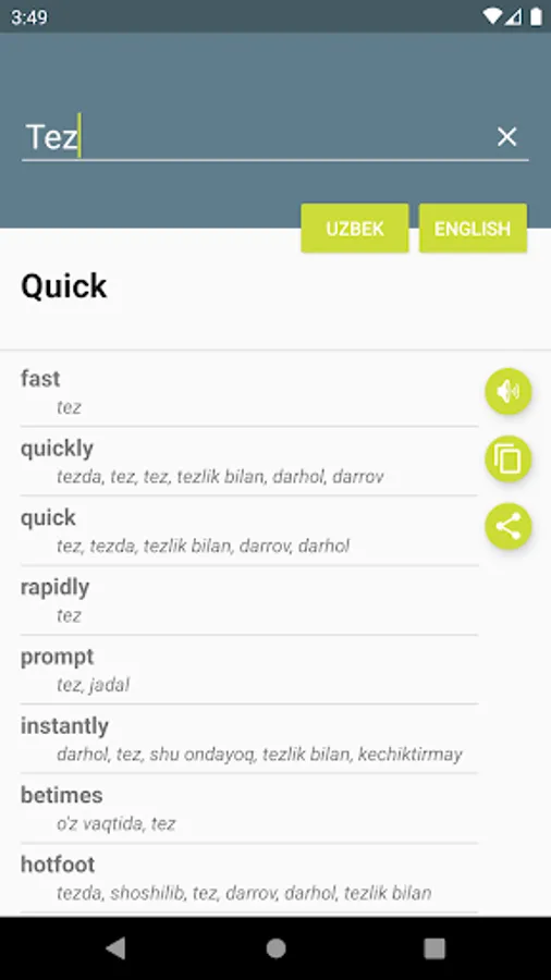 O'zbekcha-inglizcha lug'at yordamida siz doimiy ravishda kengaytiriladigan so'zlarning ulkan ma'lumotlar bazasiga kirish imkoniyatiga ega bo'lasiz.