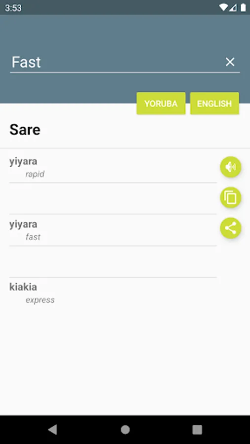 Kaabọ si Iwe-itumọ Gẹẹsi-Yoruba, ohun elo ti o ga julọ lati ṣe iranlọwọ fun ọ lati tumọ eyikeyi ọrọ ti o fẹ lati Yoruba si Gẹẹsi.