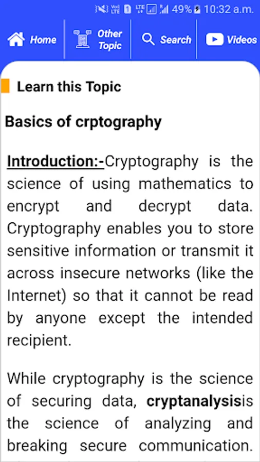 This App covers the basics of the science of cryptography. It explains how programmers and network professionals can use cryptography to maintain the privacy of computer data. Starting with the origins of cryptography, it moves on to explain cryptosystems, various traditional and modern ciphers, public key encryption, data integration, message authentication, and digital signatures