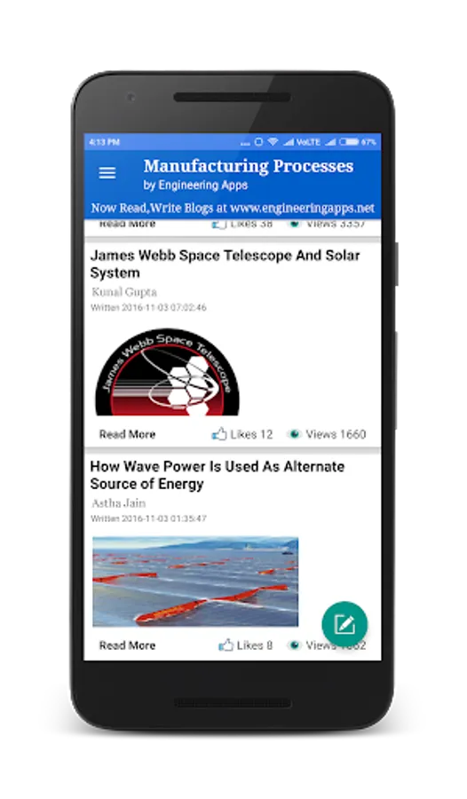 You can also blog about engineering technology, innovation, engineering startups, college research work, institute updates, Informative links on course materials & education programs from your smartphone or tablet or at http://www.engineeringapps.net/.