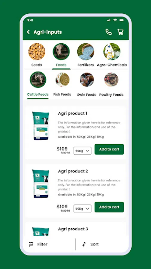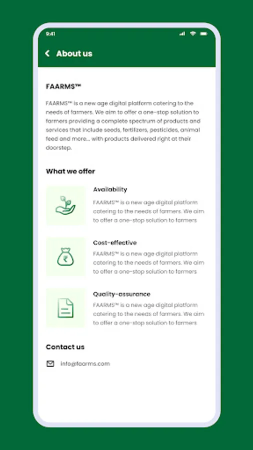 FAARMS provides services like - allowing to buy agro-inputs including seeds, cattle feeds, bio-fertilizers, agrochemicals, insecticides, pesticides, herbicides and much more. You can also purchase agro-equipment and machineries.