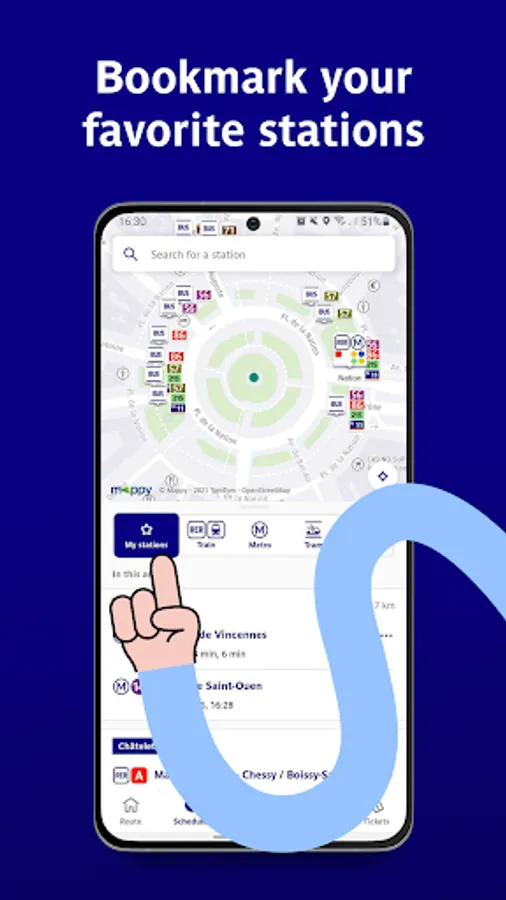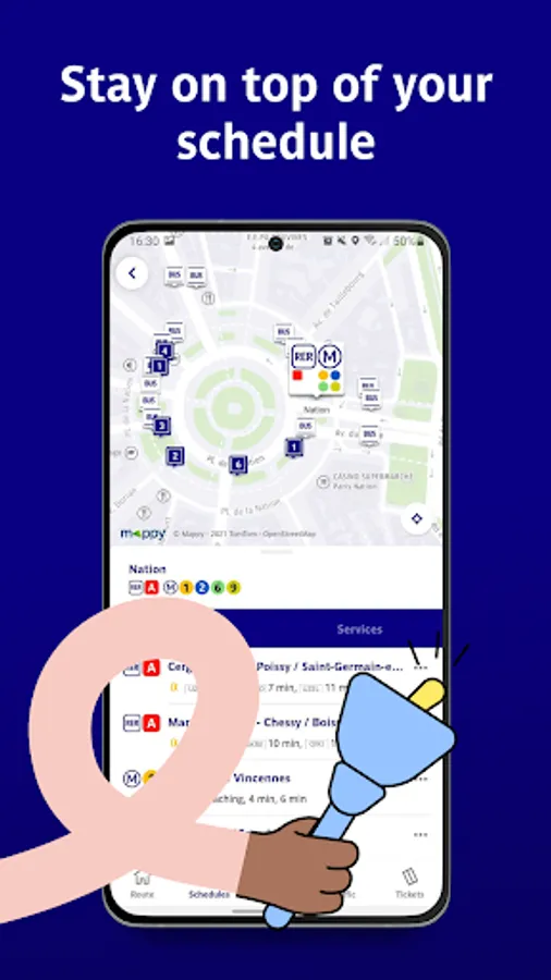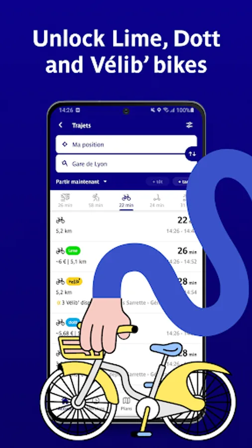 All your journeys in Paris and its suburbs at your fingertips: Bus, Subway, Tube, RER train, Tram, suburban train, Velib' bike-share, LIME bike-share and DOTT bike-share, Marcel hail ride, TIER scooters, LIME scooters and DOTT scooters or Noctilien night bus and Orlyval airport shuttle.