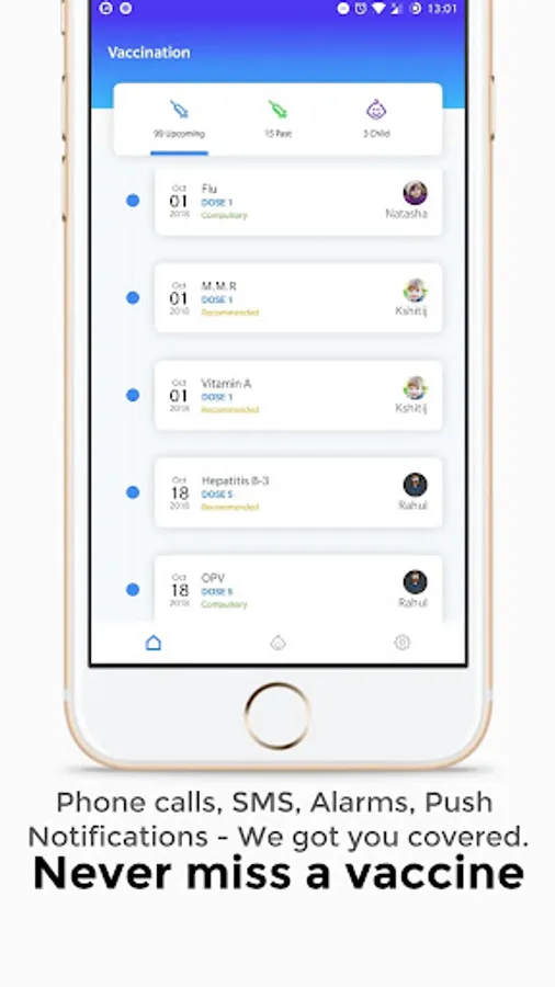 Get reminded for every vaccine starting from two days before the vaccination day. Through phone calls, SMS and alarms for missed vaccines.