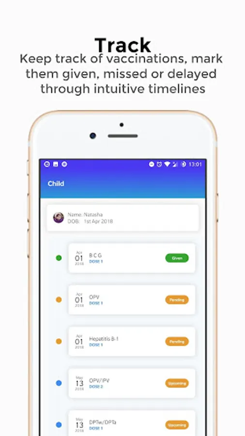 View every child's vaccination timeline. Mark vaccinations as given, or delay them accordingly to push the dates forward in case you miss them!