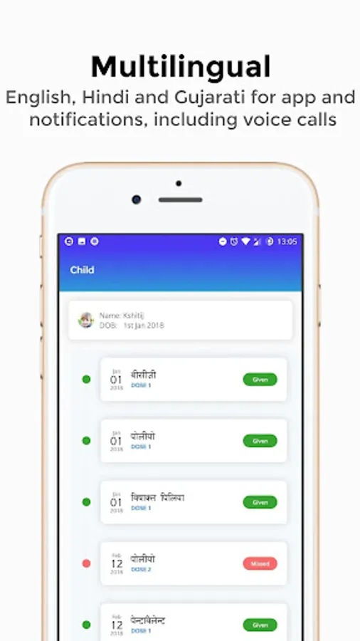 Vaccination lists and notifications in your preferred language. Currently supporting English, Hindi and Gujarati.