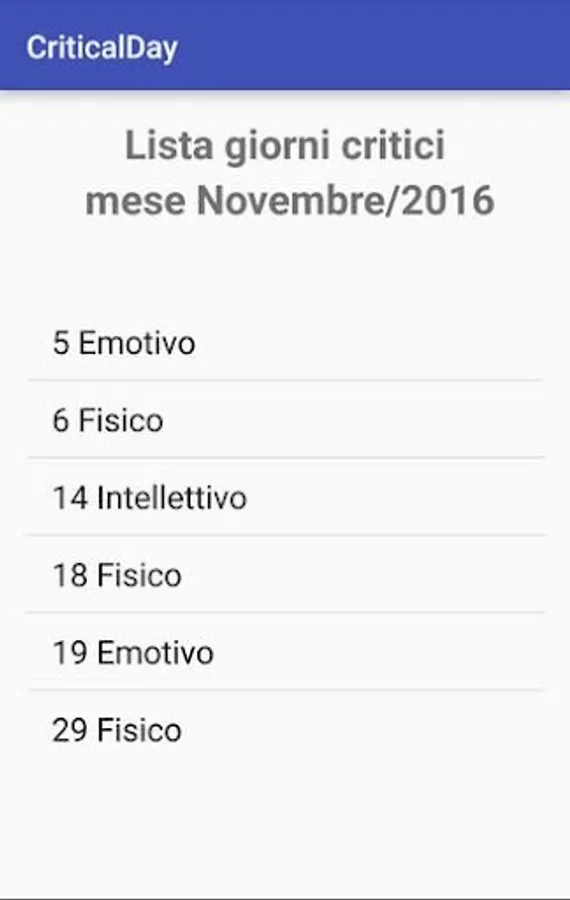 The final list presented by the app lists for the month of the year selected a list of days with specified critical biorhythm cycles.