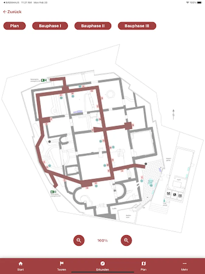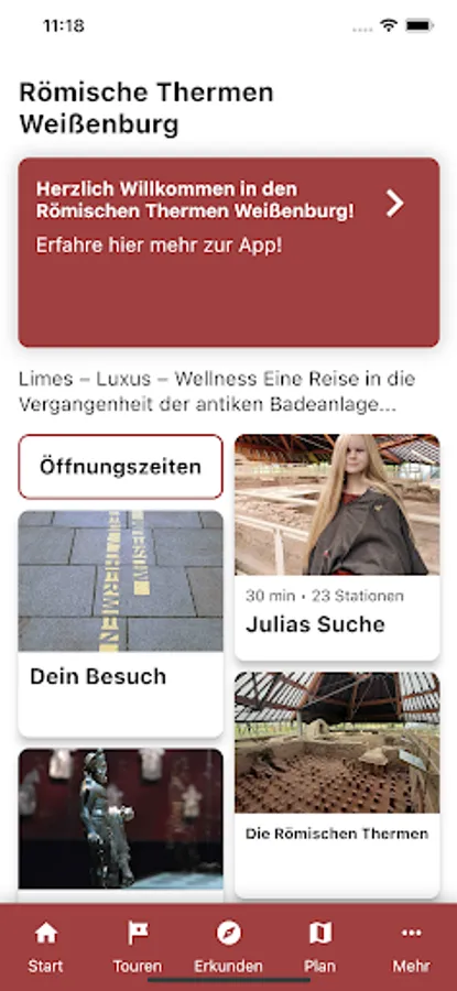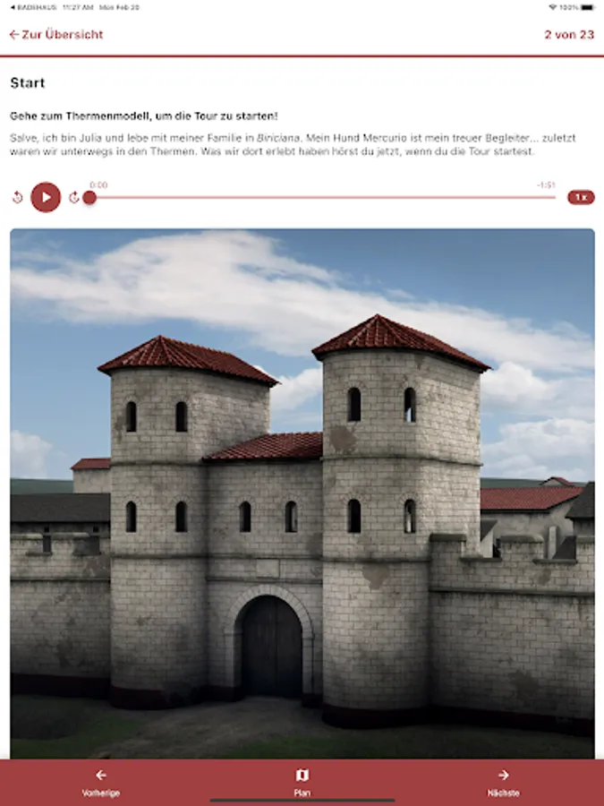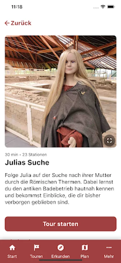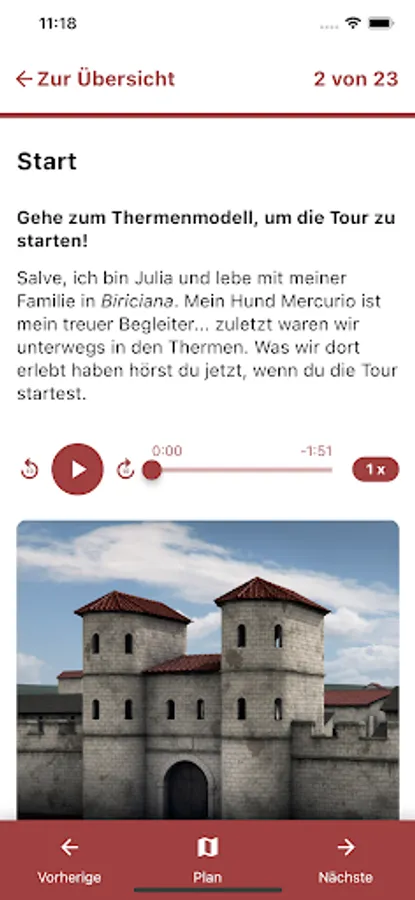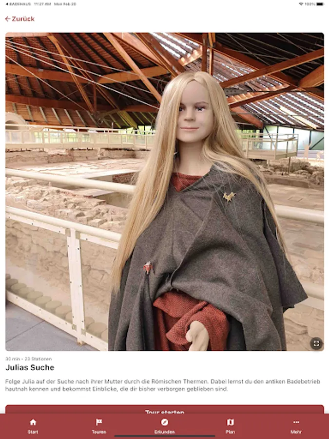 With the app, a visit to the Roman thermal baths in Weißenburg can be prepared at home - opening times, directions and current information can be easily found. On site, the app offers an audio tour that leads into the second construction phase (approx. 160 AD) of the ancient bathing complex. The tour was developed by a P seminar at the Feuchtwangen grammar school (especially for children). With Julia every important area of the thermal baths can be explored, but she is also on a very important search ...