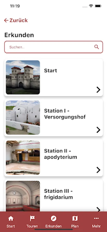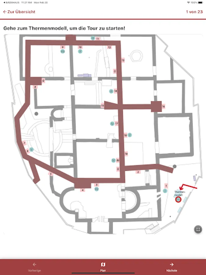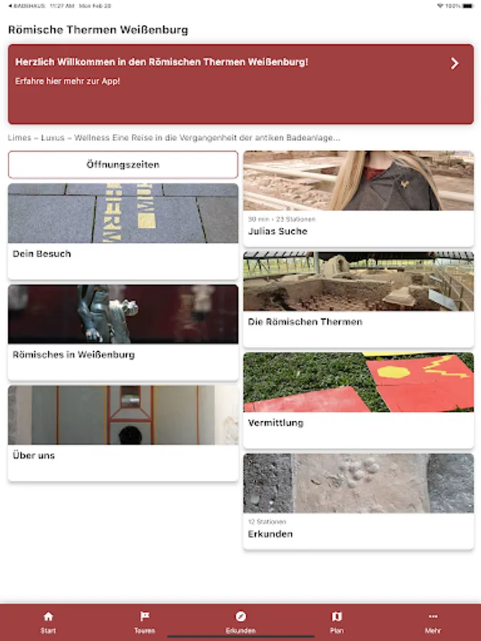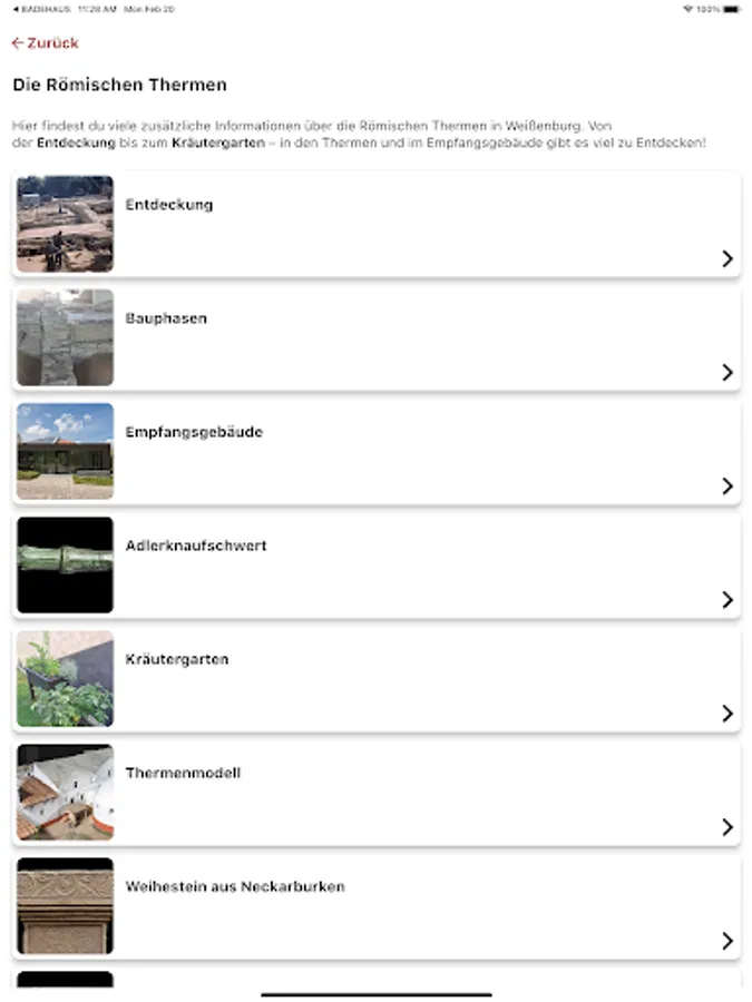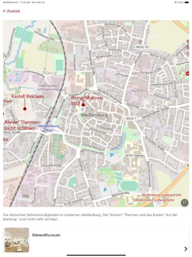 Furthermore, the app offers a lot of interesting facts about the Roman thermal baths in Weißenburg: From discovery to restoration to new installations such as consecration stones or the thermal bath model. These individual stations, which deal with the most important rooms, can also be called up individually in the "Explore" menu. Other exhibition points can also be explored individually: Why is there an eagle on the handle in the reception building or how about a delicious Roman recipe from the herb garden?