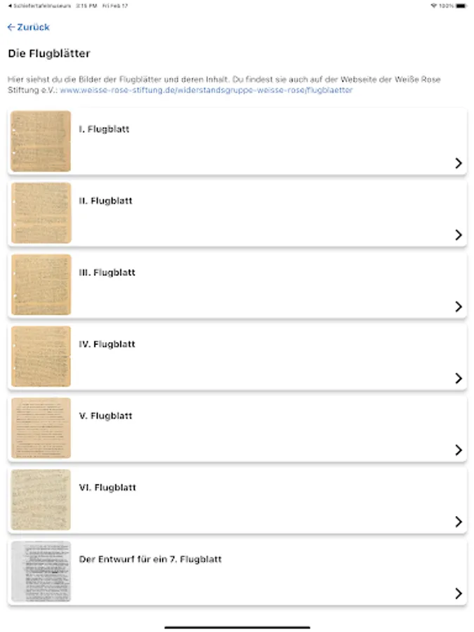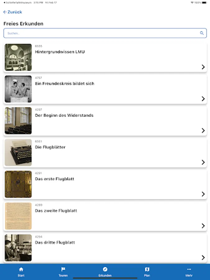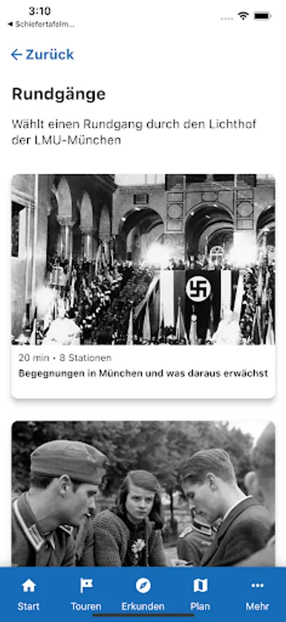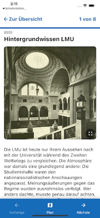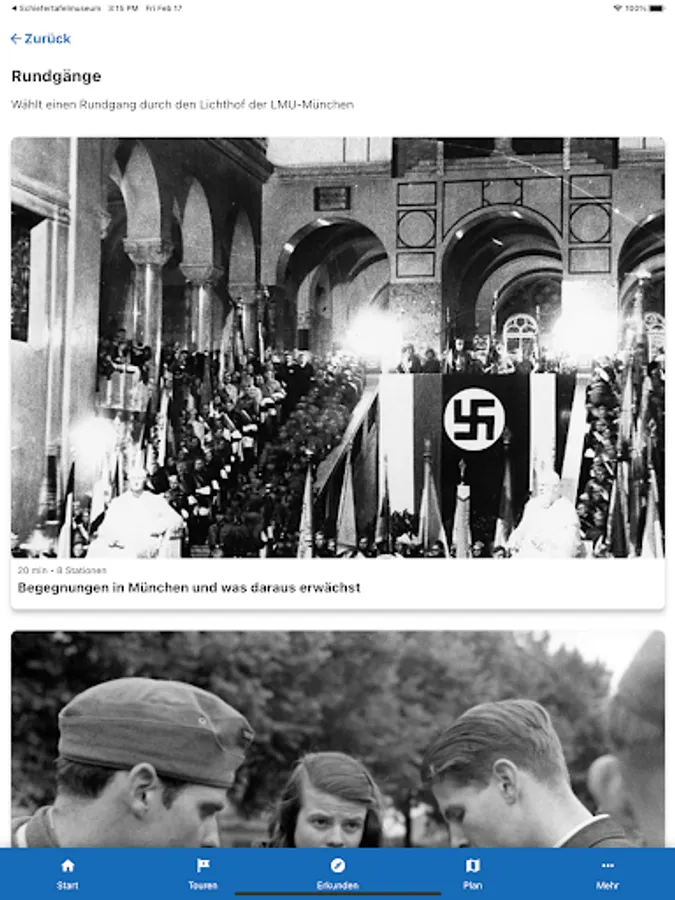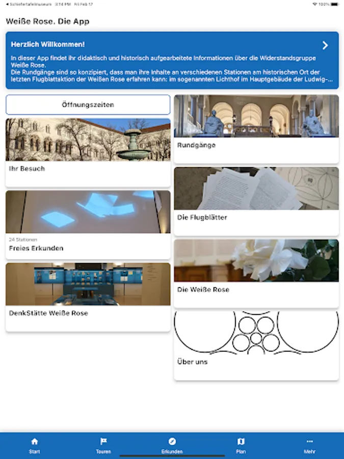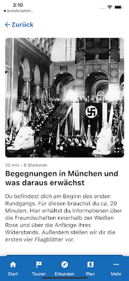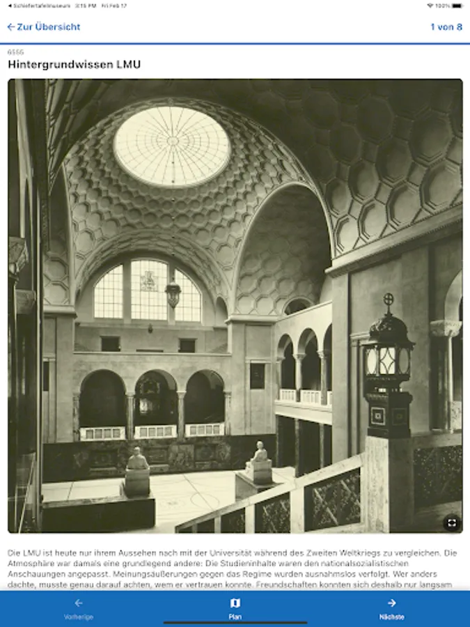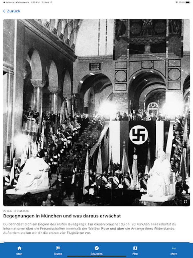 It offers didactic information about the people and actions of the resistance group White Rose. On four thematically oriented tours (each 20 minutes) she takes you through the main building of the Ludwig-Maximilians-University (LMU) in Munich. The app is specially designed for use at the historical site, but can be used from any other location.
