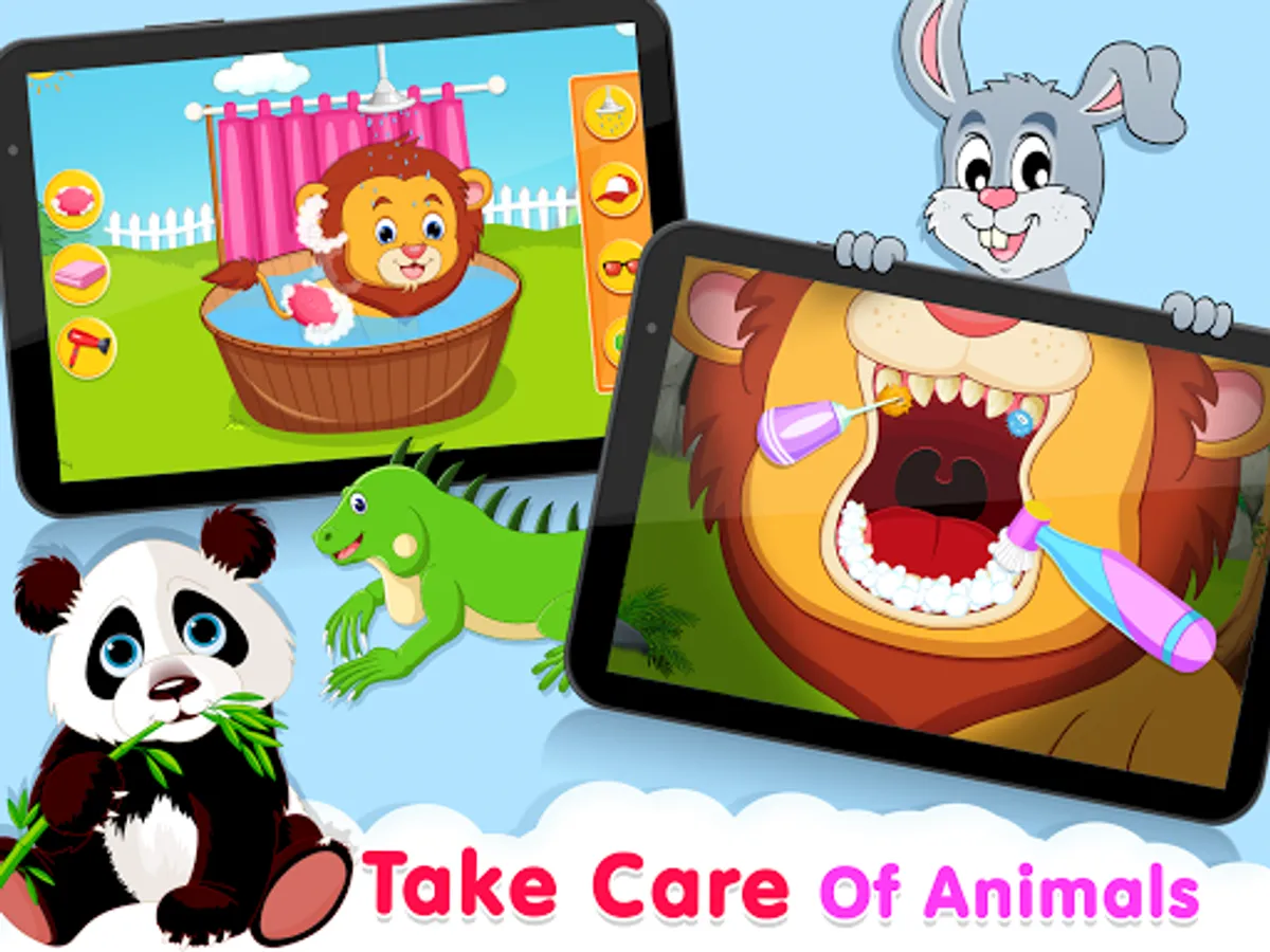 There are 9 animals to take care like beer, lion, kangaroo, elephant, ant, duck, panther, quail, Monkey. The pets can have a cold, fever, conjectivitis allergy, earache, sore throat or stomach ache. You will also learn to heal wounds and scratches, broken nails and even to remove splinters, fleas and ticks from them.