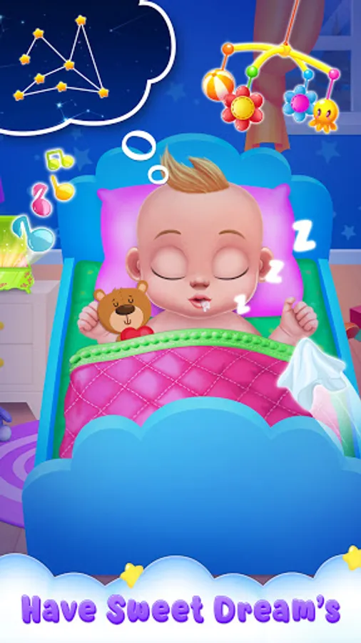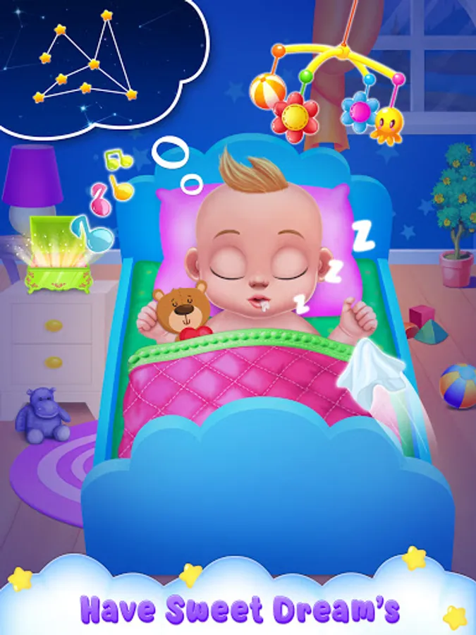 Baby is tired and sleepy after so much playing. Give him his favorite toy and dummy to get a good night's sleep. Cover the baby with a funky bedspread. Now, everything is fine to rock the baby and lull him to sleep.