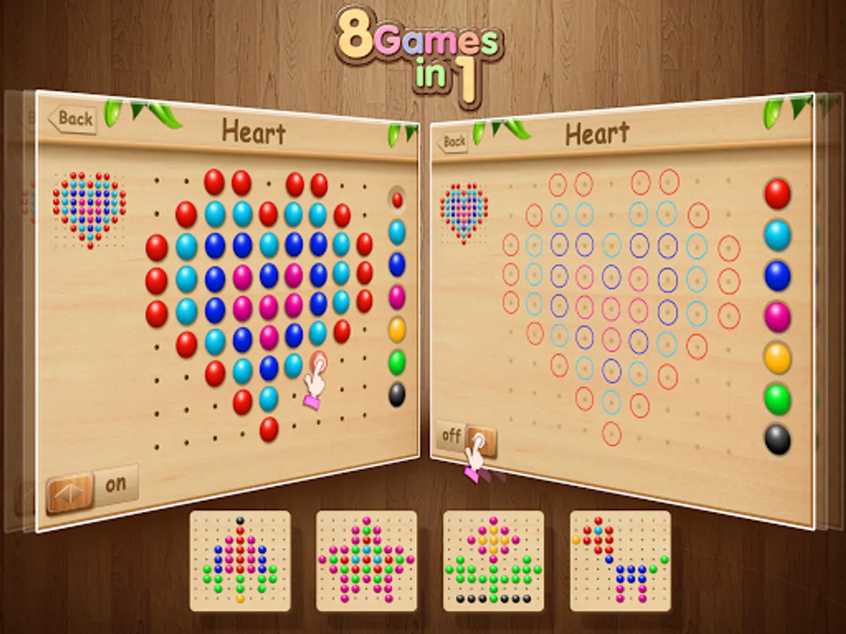 The game has a number of small and big cards, or “boards” with patterns based on a grid, and a bank of pins which are used to complete the board. The patterns are made of colored circles, and the object is to place identically-colored “pins” from the bank on those circles by touching the pin of the correct color and then touching the grid location where they want it. It requires very simple motor skills, yet engages the mind and the brain in several ways.