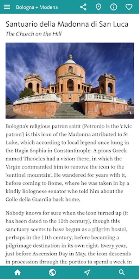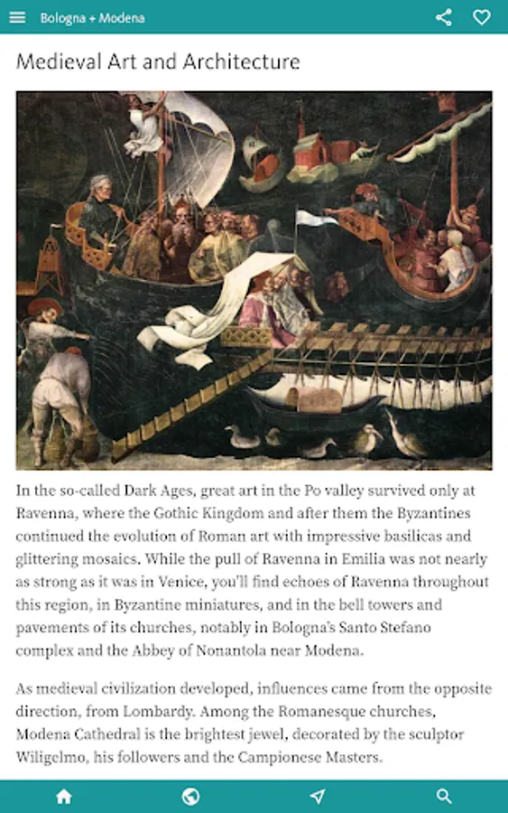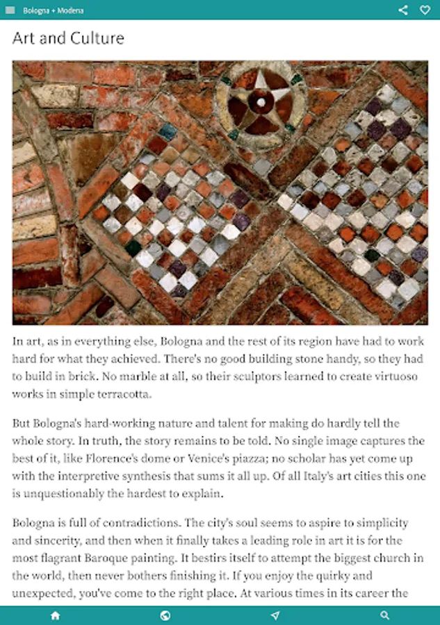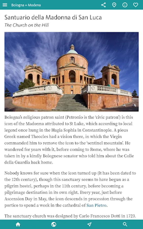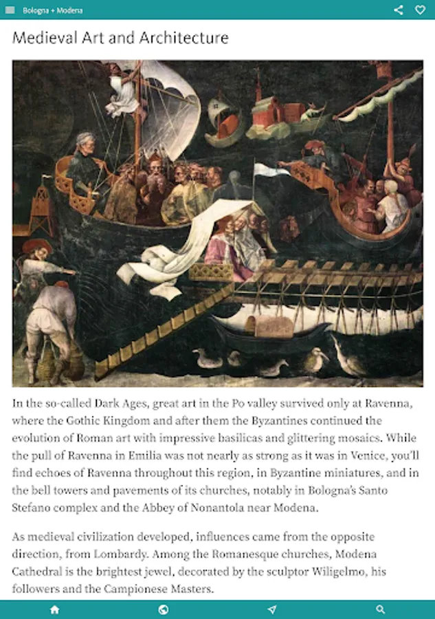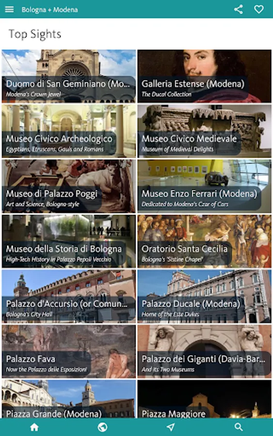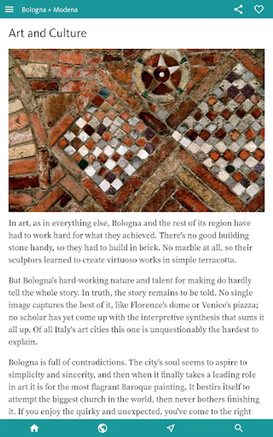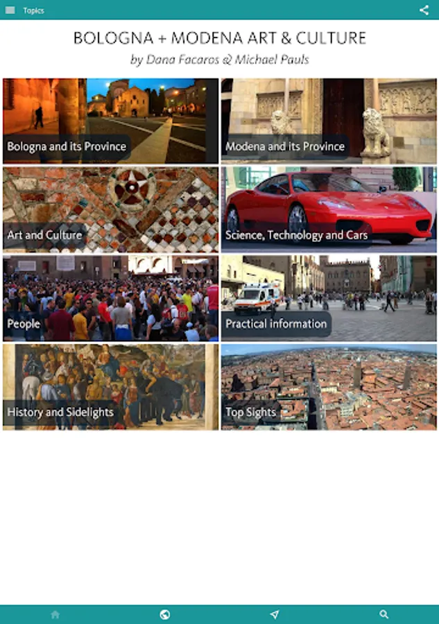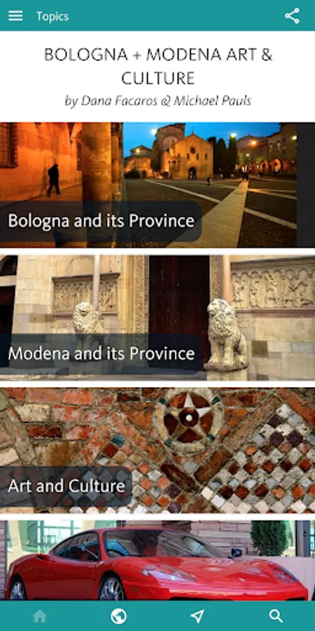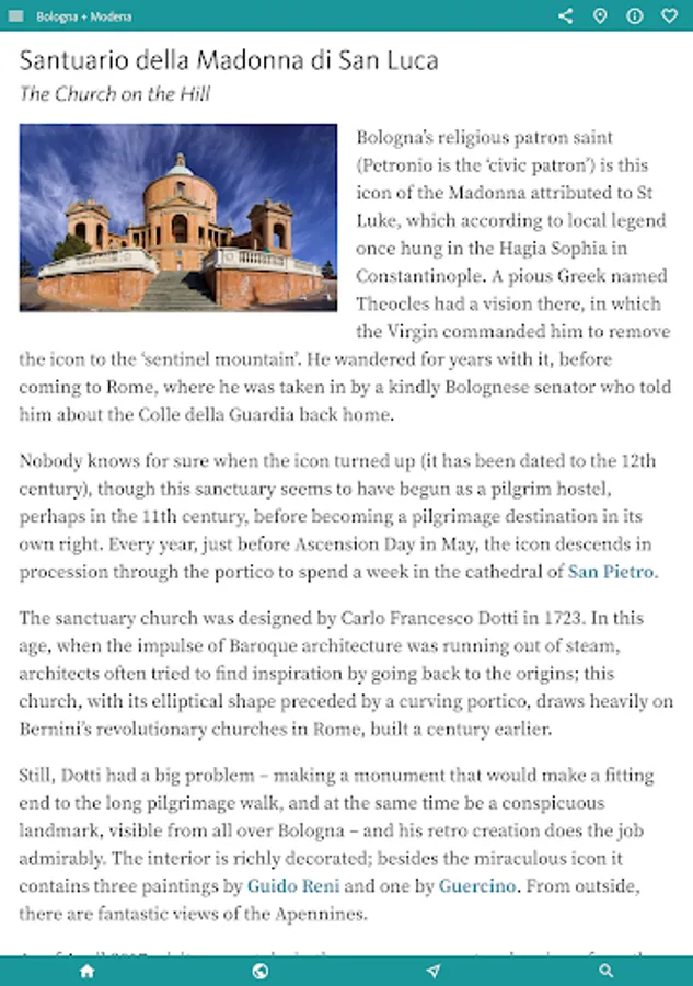 BOLOGNA AND MODENA is the first and only app to cover in depth two of Italy's greatest and least-spoiled art cities. It’s essential for exploring the richness of their histories and their vibrant life of today. We don’t do hotels and restaurants and shopping; instead, we offer a cultural companion that can enrich your visit like no other guide.