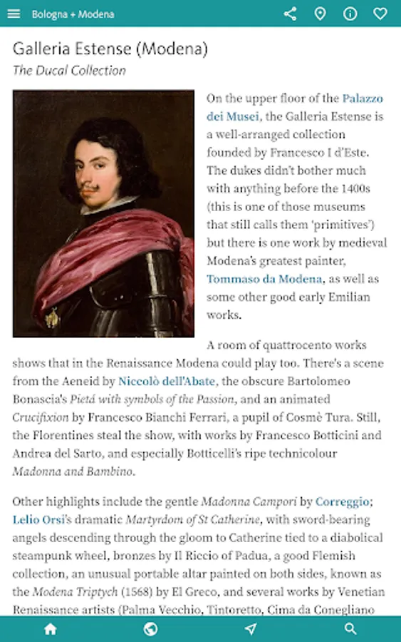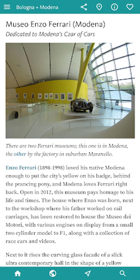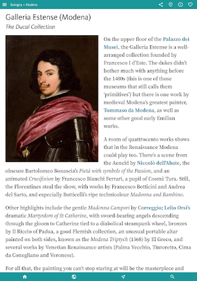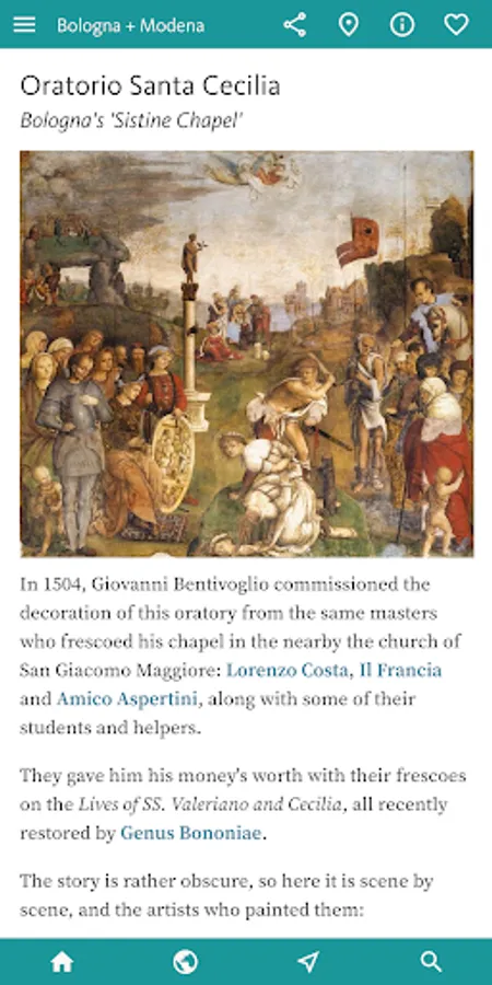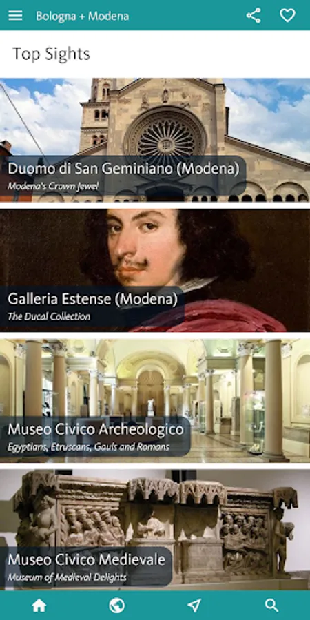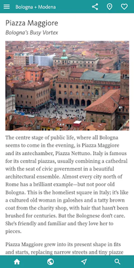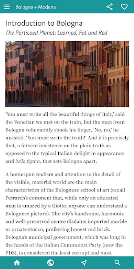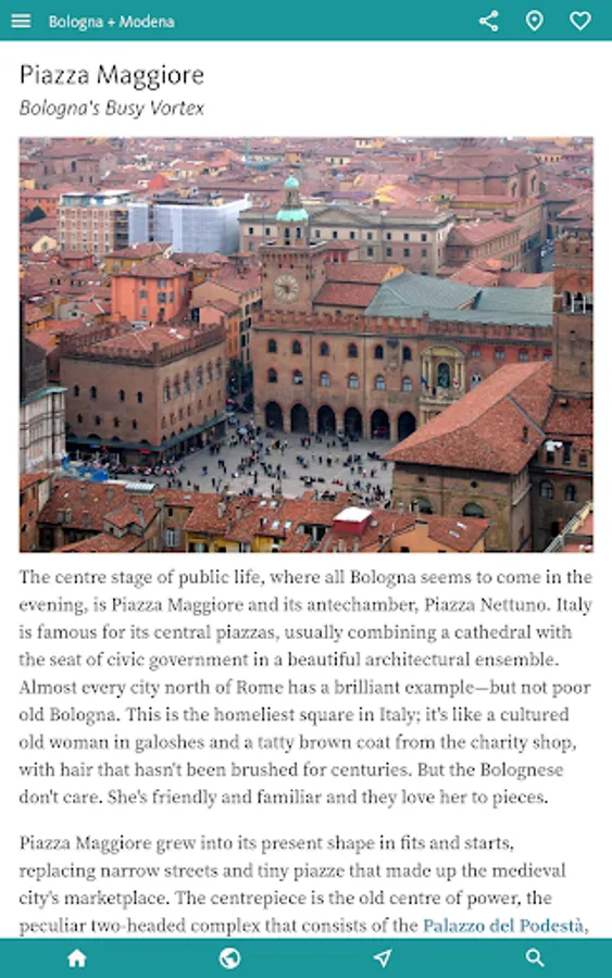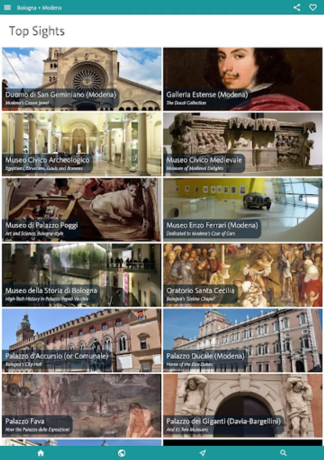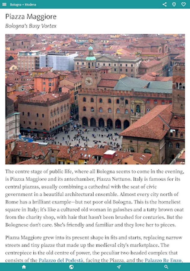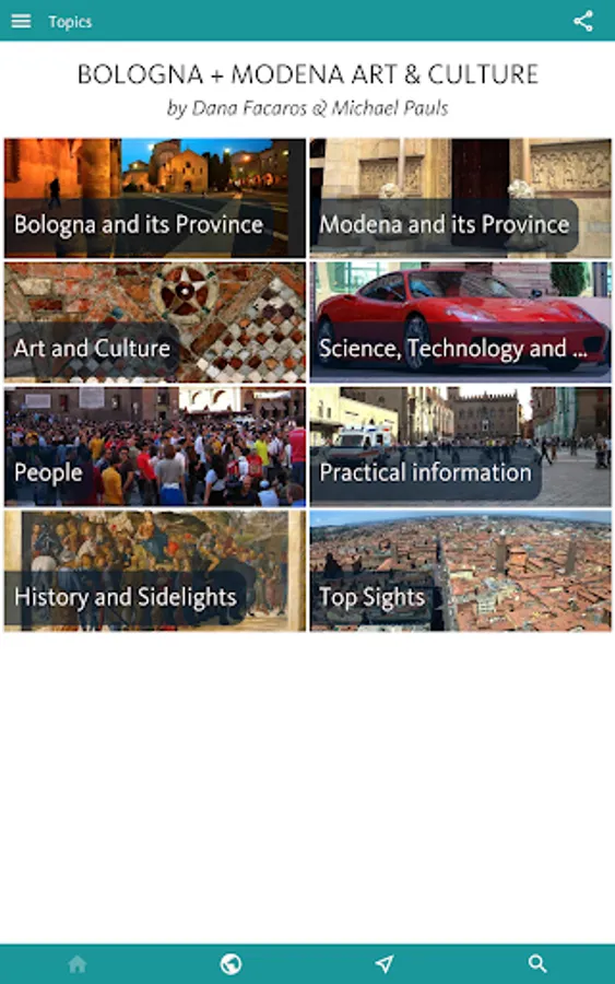 BOLOGNA AND MODENA is the first and only app to cover in depth two of Italy's greatest and least-spoiled art cities. It’s essential for exploring the richness of their histories and their vibrant life of today. We don’t do hotels and restaurants and shopping; instead, we offer a cultural companion that can enrich your visit like no other guide.
