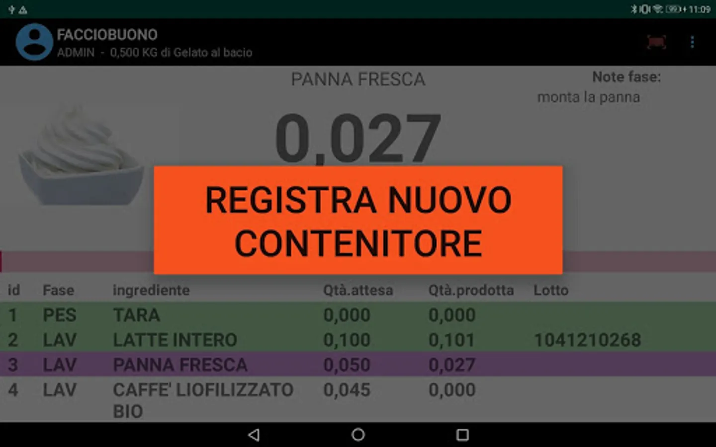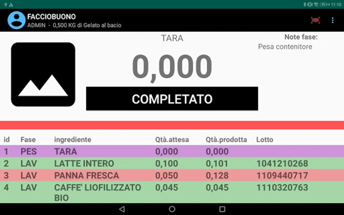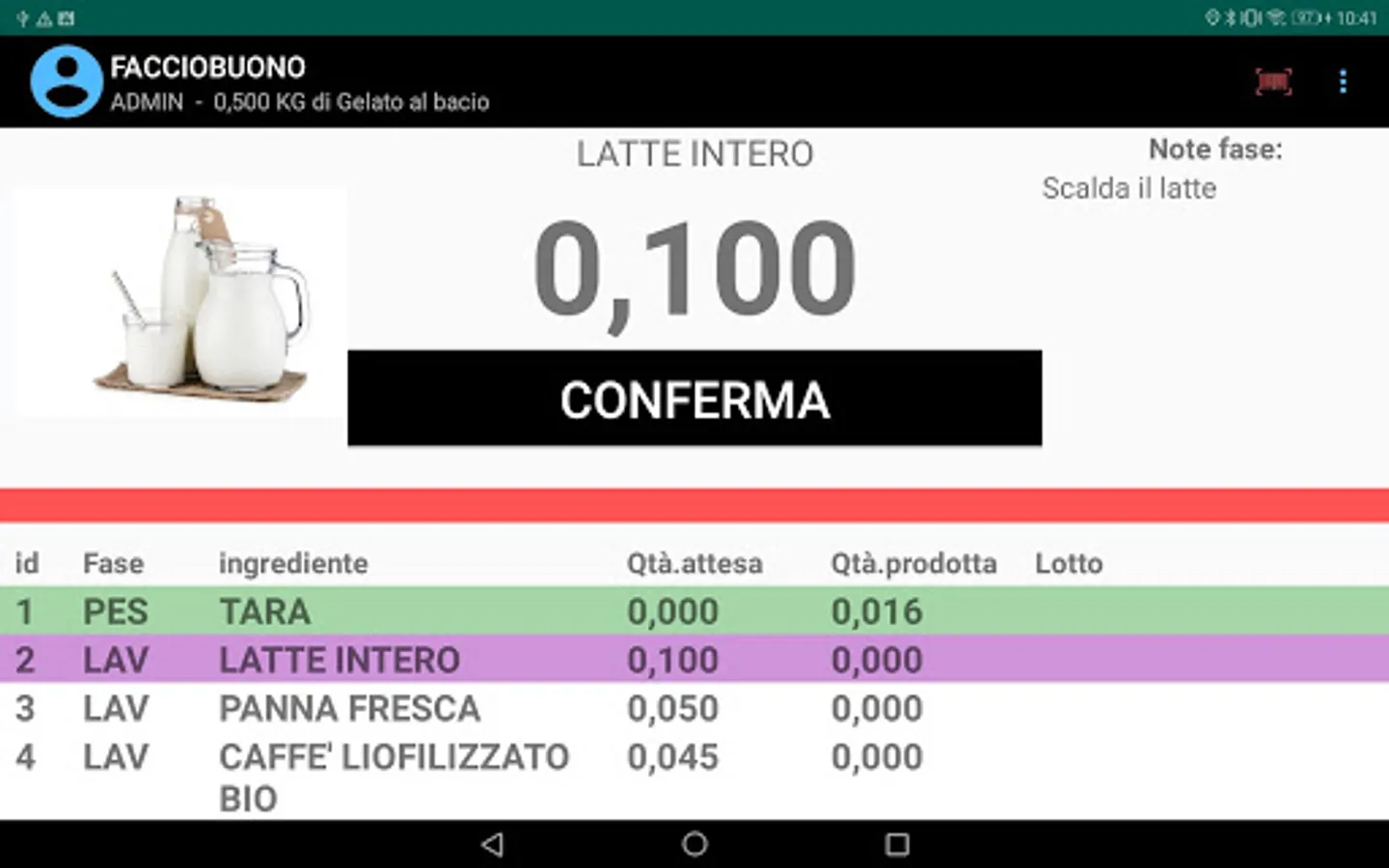 Application allows connection to the Bluetooth scale. Upload the data from the server to obtain the recipe to be produced, check the weight of the ingredient if it has reached the quantity required in production if the quantity is exceeded it will be possible to recalculate by default and / or excess. In order to start the application you need to log in to the management software and select the recipe you want to produce.