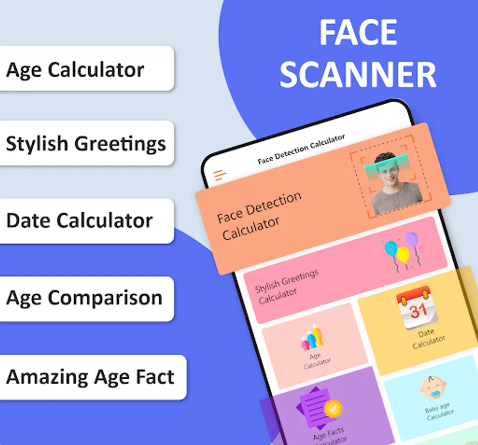 - You can share your suggestions, problems, and issues you faced in this date calculator & face age calculator by date of birth app during the face scan, calculation of age, or share the exact age with your friends and family from this Age calculator by face scanner app. This is the most advanced Face scan age app free with ultimate features to calculate the exact age.