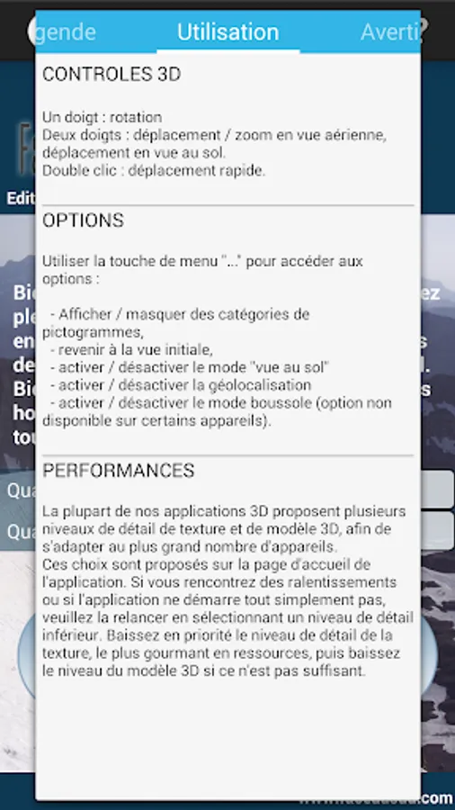 The aerial view and floor to illustrate the general view raised to a level of precision optimized, it is displayed on the screen depending on the definition of the relief and texture chosen to launch the application automatically loaded or select according to device capabilities used.
