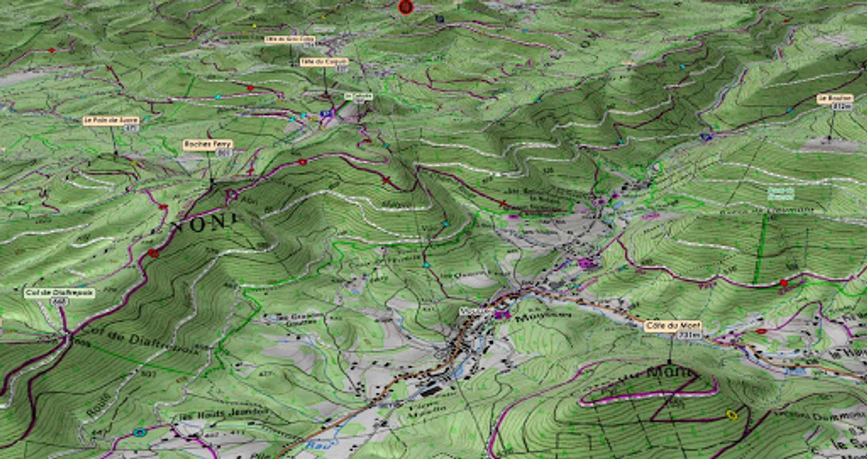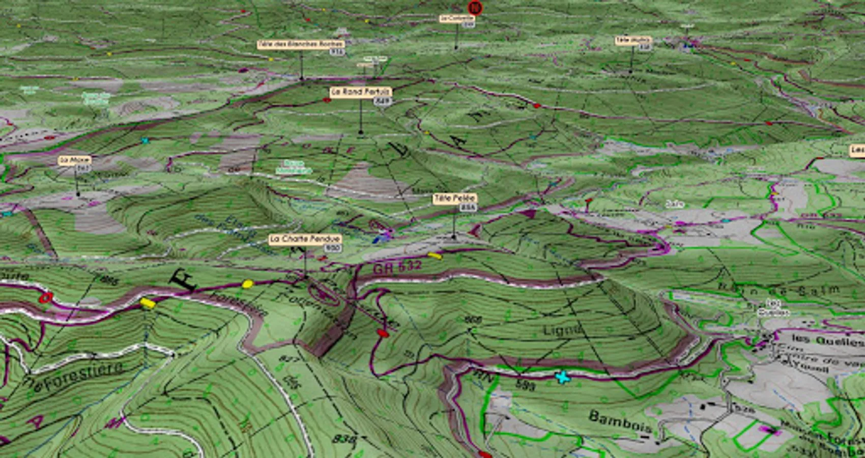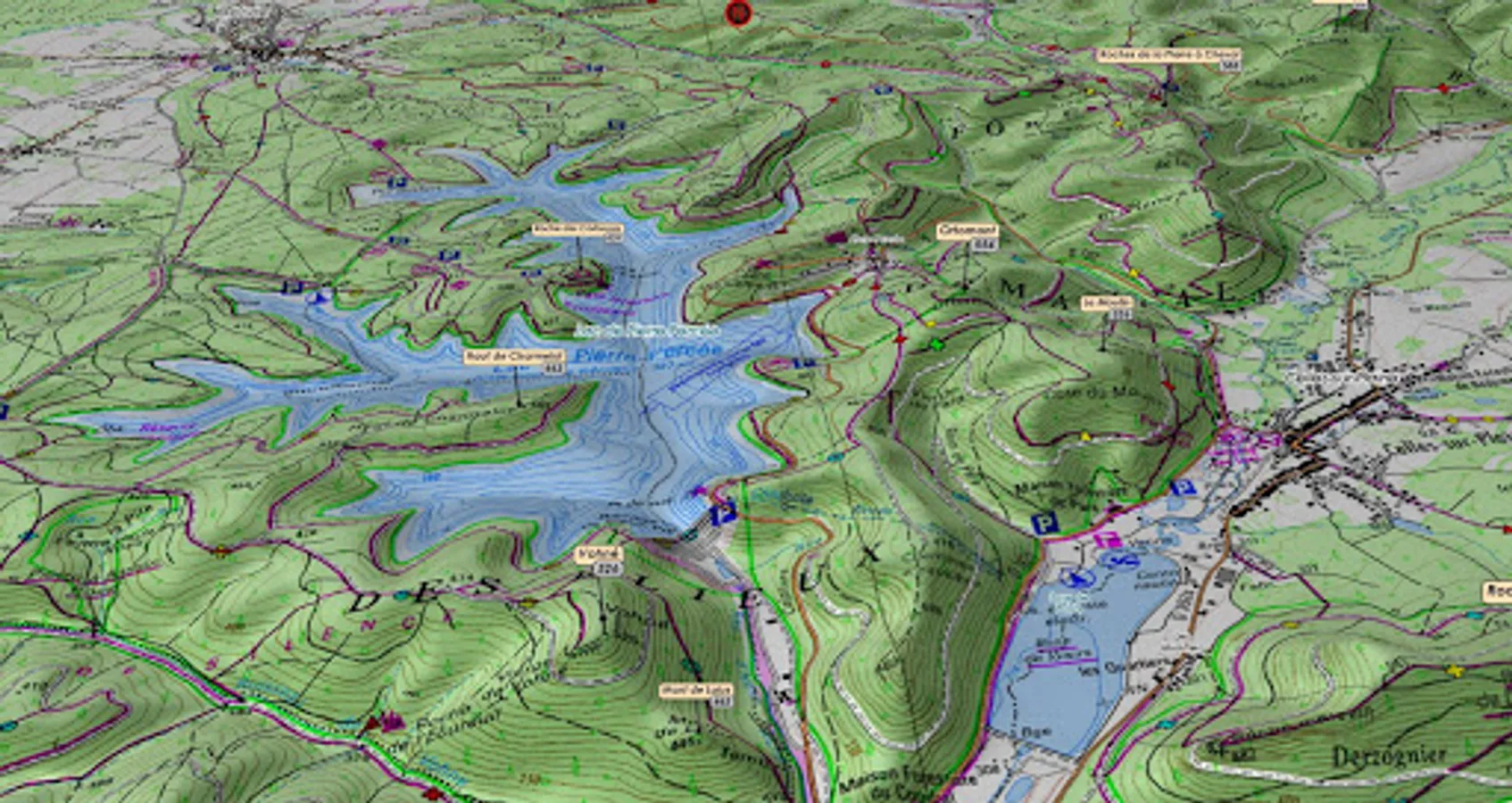 ○ The pictograms of summits, passes, lakes, towns, refuges ... allow an unprecedented location in the relief of the map or the aerial image.