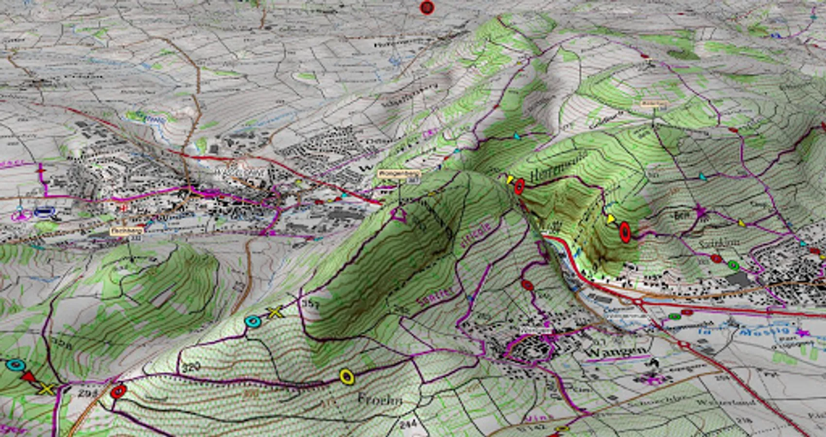 The compass mode is integrated into 3D, the cardinal points orient themselves according to manual movements or the map automatically orientates to North by activating the compass mode.