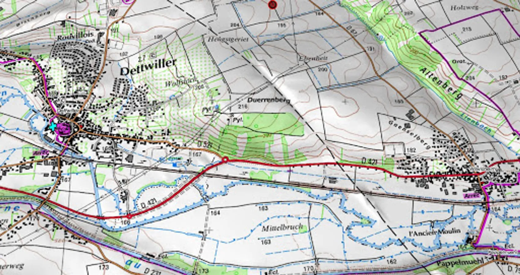 Hiking map showing the hiking routes marked by the Club Vosgien from Steinbourg-Dettwiller-Dossenheim sur Zinsel for the western limit to Brumath-Vendenheim-Souffelweyersheim for the eastern limit.