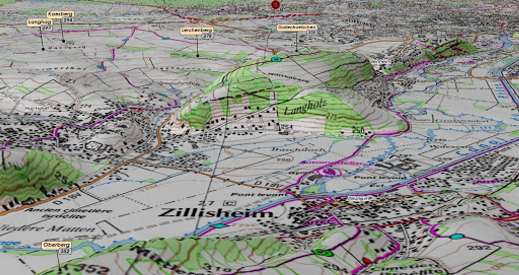 The aerial view and the ground view illustrate the general relief at an optimized level of precision, it is displayed on the screen according to the 1.25000 map or the aerial image.