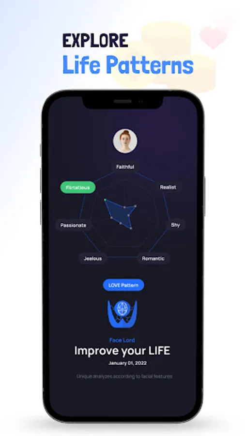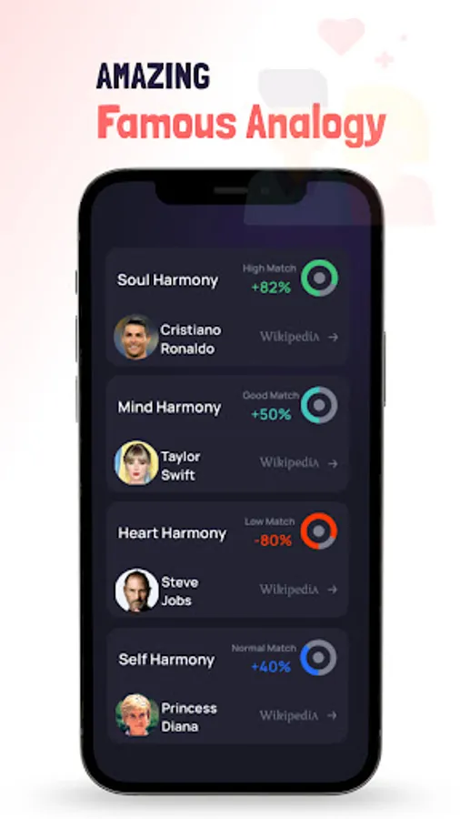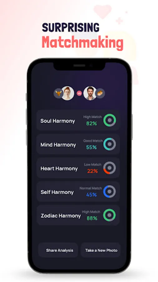 If you're in the excitement of a new relationship, or if you're experiencing tides even when you're inconsistent love, how about an analysis to support you? Is the other person really the right partner for me? If you're wondering, it's time to use AI Matchmaking, which embellishes the app. How compatible are you and your partner's face photos with your Soul, Mind, Heart, Self, and Zodiac harmony charts? You will be amazed at the results! See our incredible tips for your love life! Discover the celebrities who look the most like you. Compare yourself with who you want from these celebrities.
