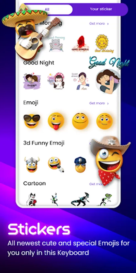 Colorful English keyboard themes with emojis are fabricated to display a vast variety of themes along with different writing styles for typing and use multilingual features to communicate while typing. A Lot of new Faceemoji Keyboard pack are available in this emoji keyboard iphone style app. Face emoji Keyboard app has wonderful Sticker, GIF & Emoji keyboard Stickers that includes the packages within e.g: sticker 1, sticker 2. The user can easily select multiple sticker packs of their own desire. Sticker stores include the following categories: cartoons, good night, good morning, etc.
