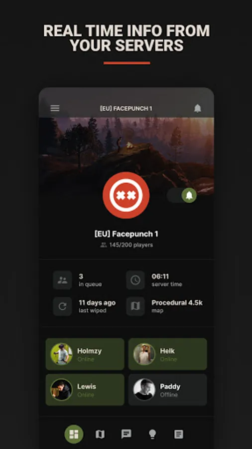 Pair with your favorite Rust servers to receive real-time updates for the things that matter the most: player counts, current game time, online teammates, and more. You’ll also get (optional) push notifications whenever one of your teammates joins the game.