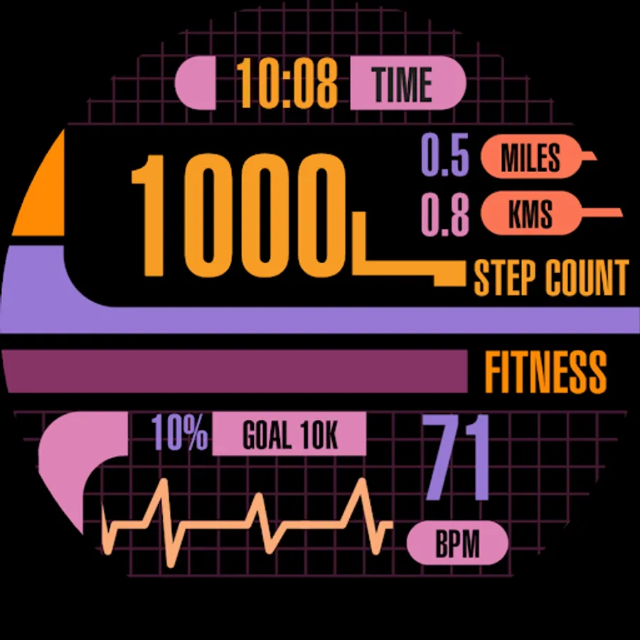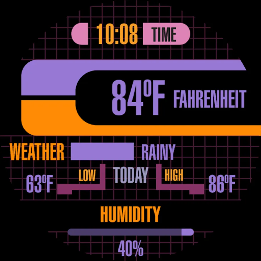 This interactive and animated watch face for Wear OS displays time, weather, activity, watch battery level, and stopwatch.