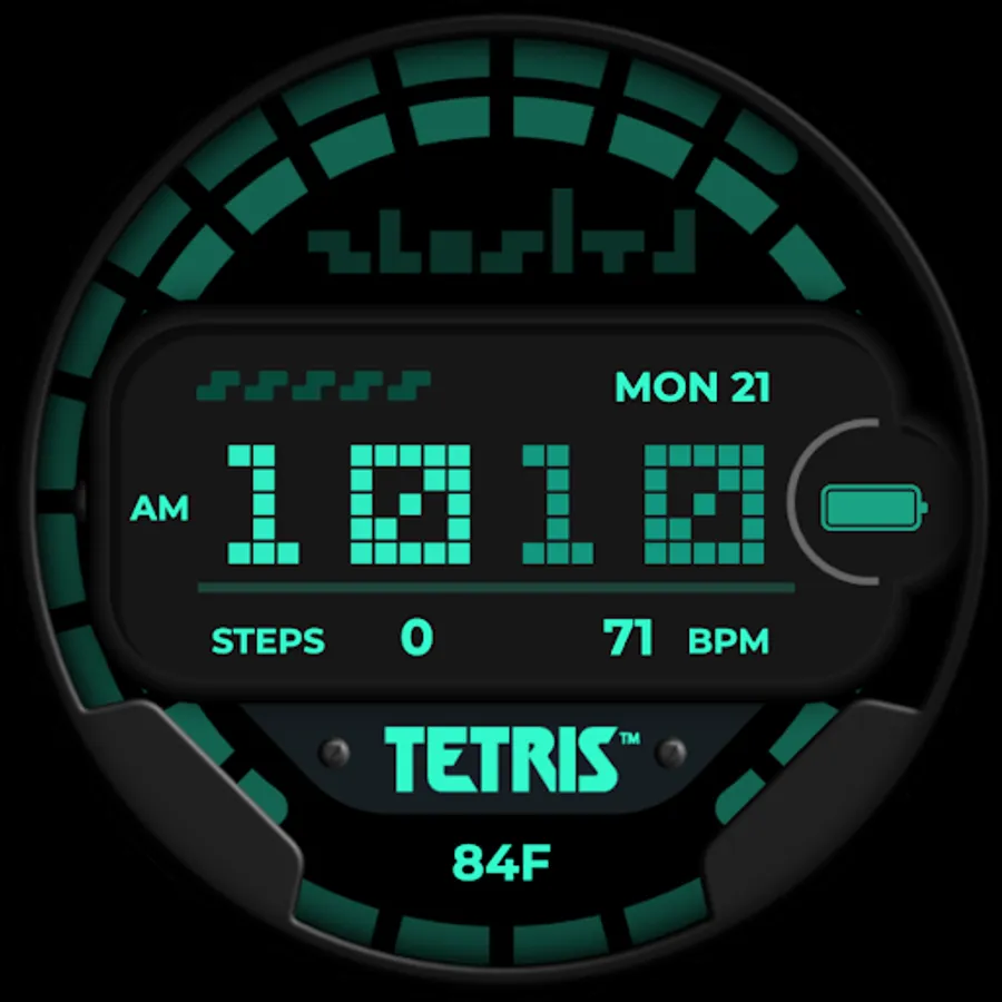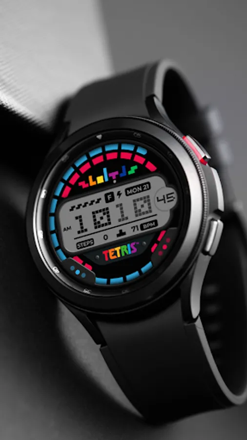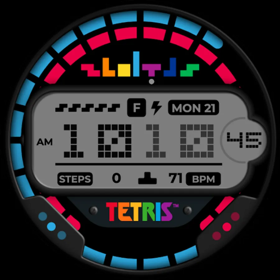 Officially licensed watch face for Wear OS featuring animated outer ring and retro style.