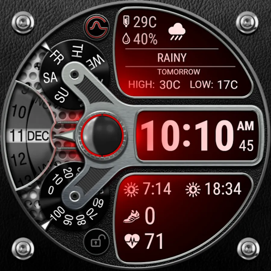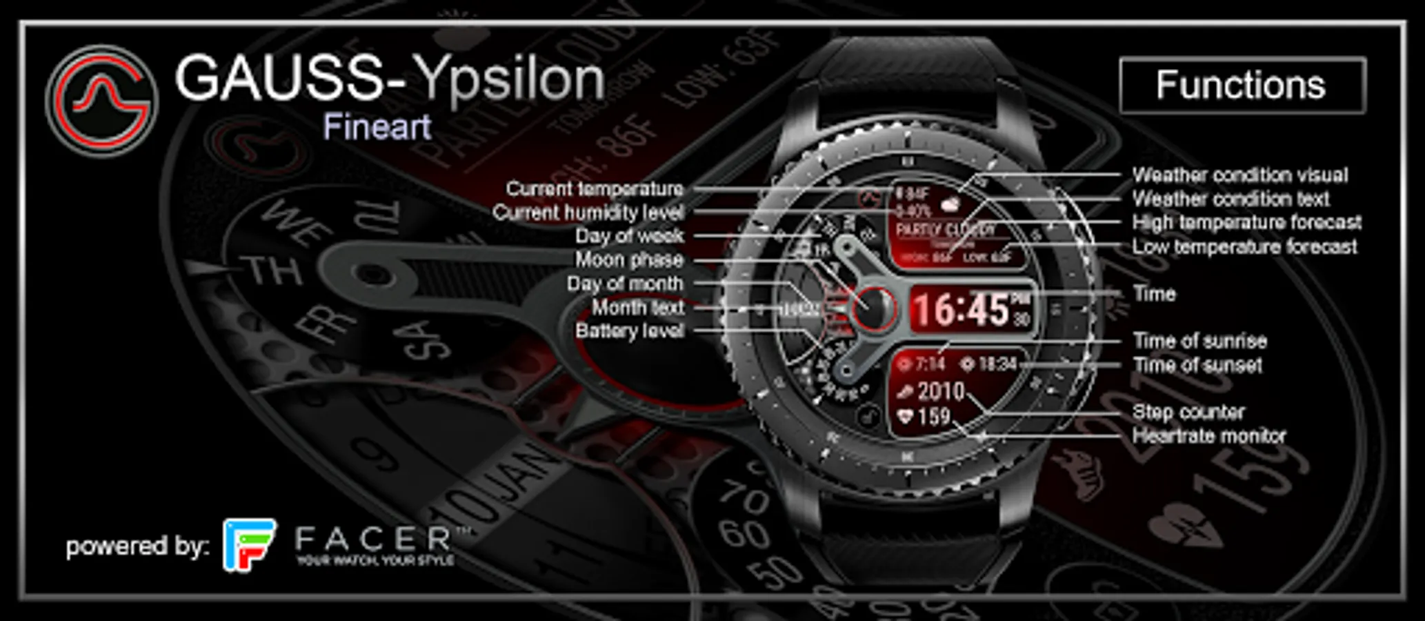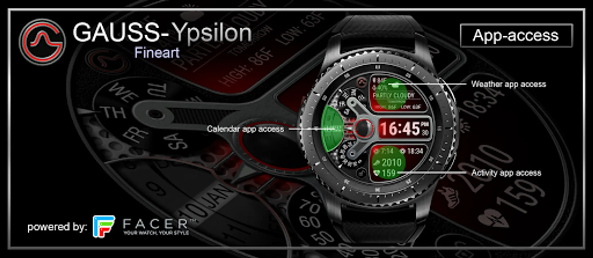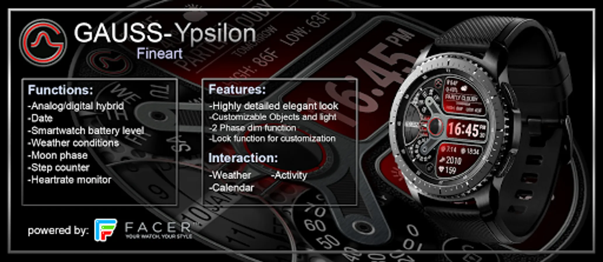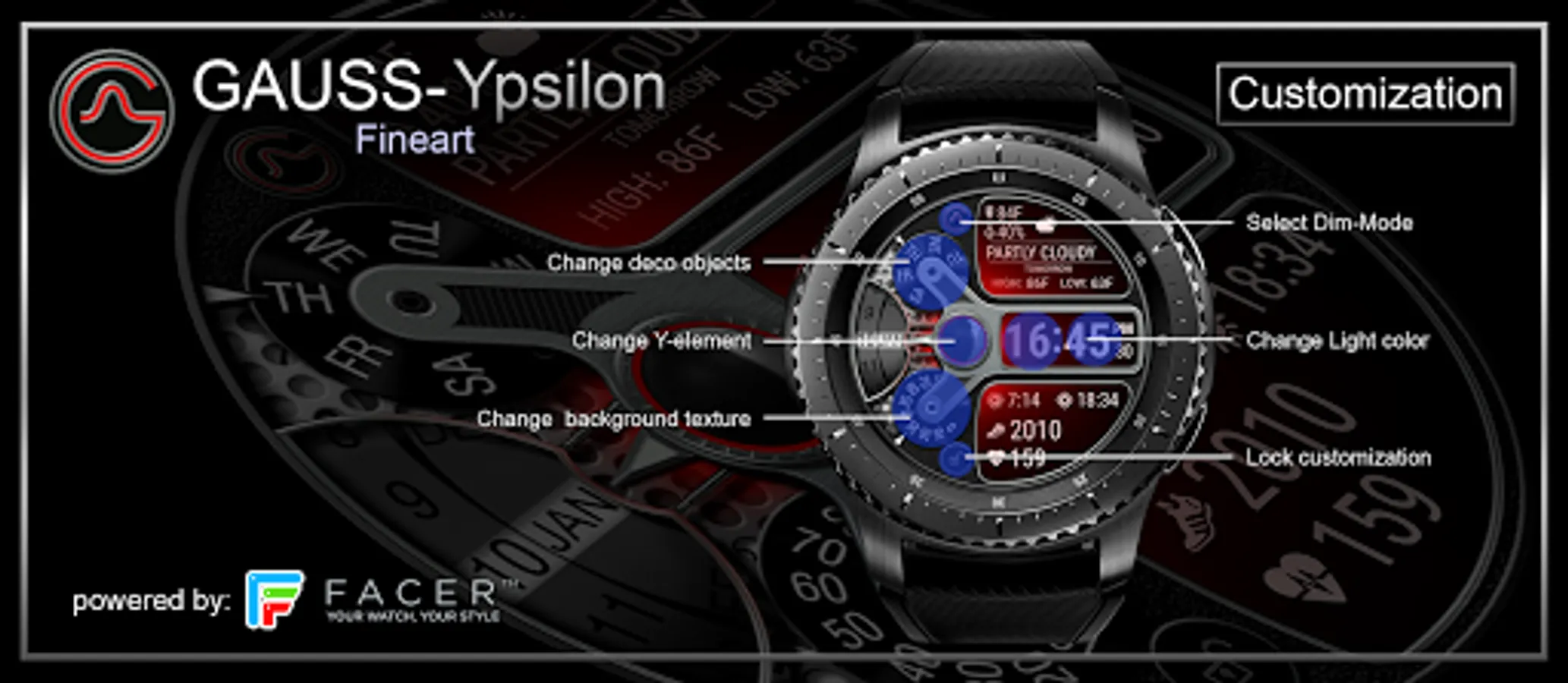 Analog meets digital. Like the GAUSS Circles, this is another unique piece of art with all functionality of modern smartwatches. A watch face fully customizable with a beautiful metallic look. As well it has chooseable light colors and a user defineable 2x4 phase Dim-mode that looks very nice and could save battery in darkest mode. Due to the sizes of the fonts it has a very good readabilty. I hope you enjoy it. Greetings, GAUSS.