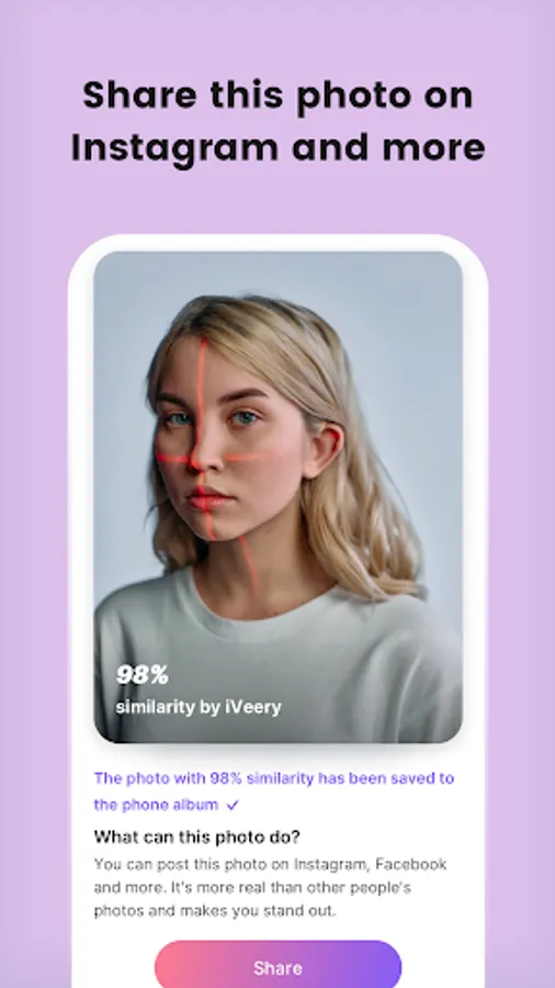 In one minute, you can put a similarity percentage (%) on your profile photo in 3 easiest steps. Then you can post this profile photo on your Instagram, Facebook and more. It would make you stand out in a sea of photos.