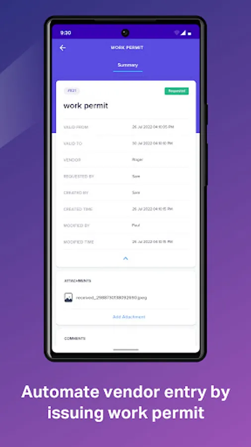Automate and simplify the vendor entry to the building by issuing invites /work permits quickly in the portal.