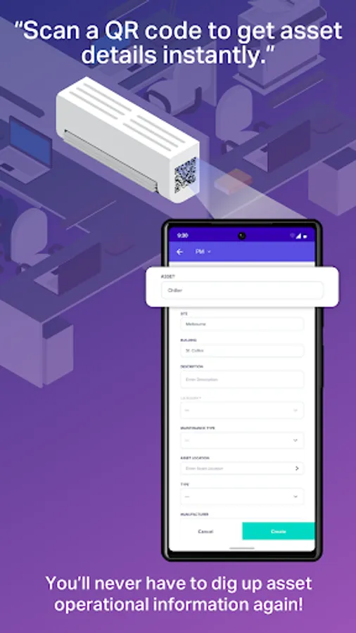 To obtain information, simply point your camera at the QR code on the asset. Understand and control the entire equipment lifecycle, including information about your asset operations, including a detailed summary and asset history details.