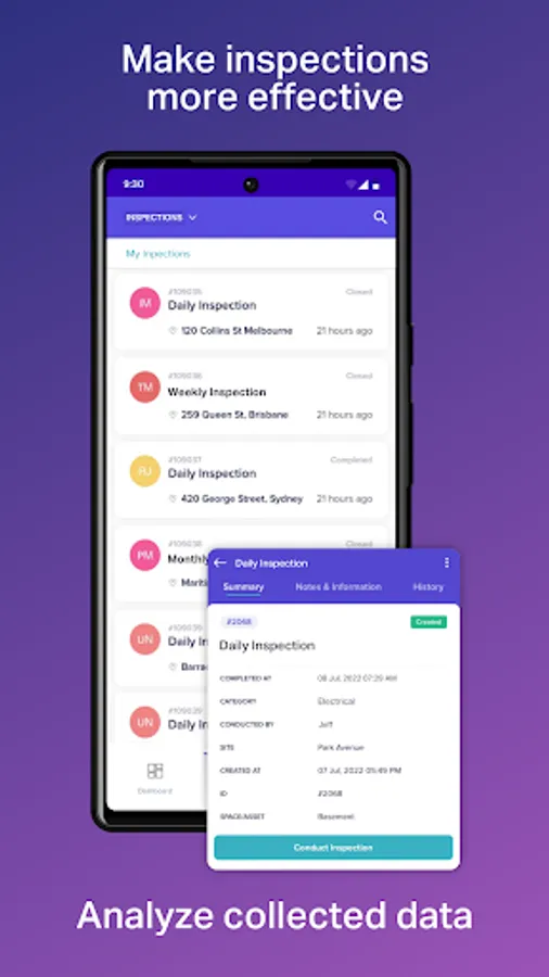 Inspections are digital forms that technicians use to quickly and easily answer a series of questions as part of a work order. They can also be associated with assets, allowing users to see a history of all inspections for a specific piece of equipment. A detailed summary of each inspection, as well as its history, can be viewed.