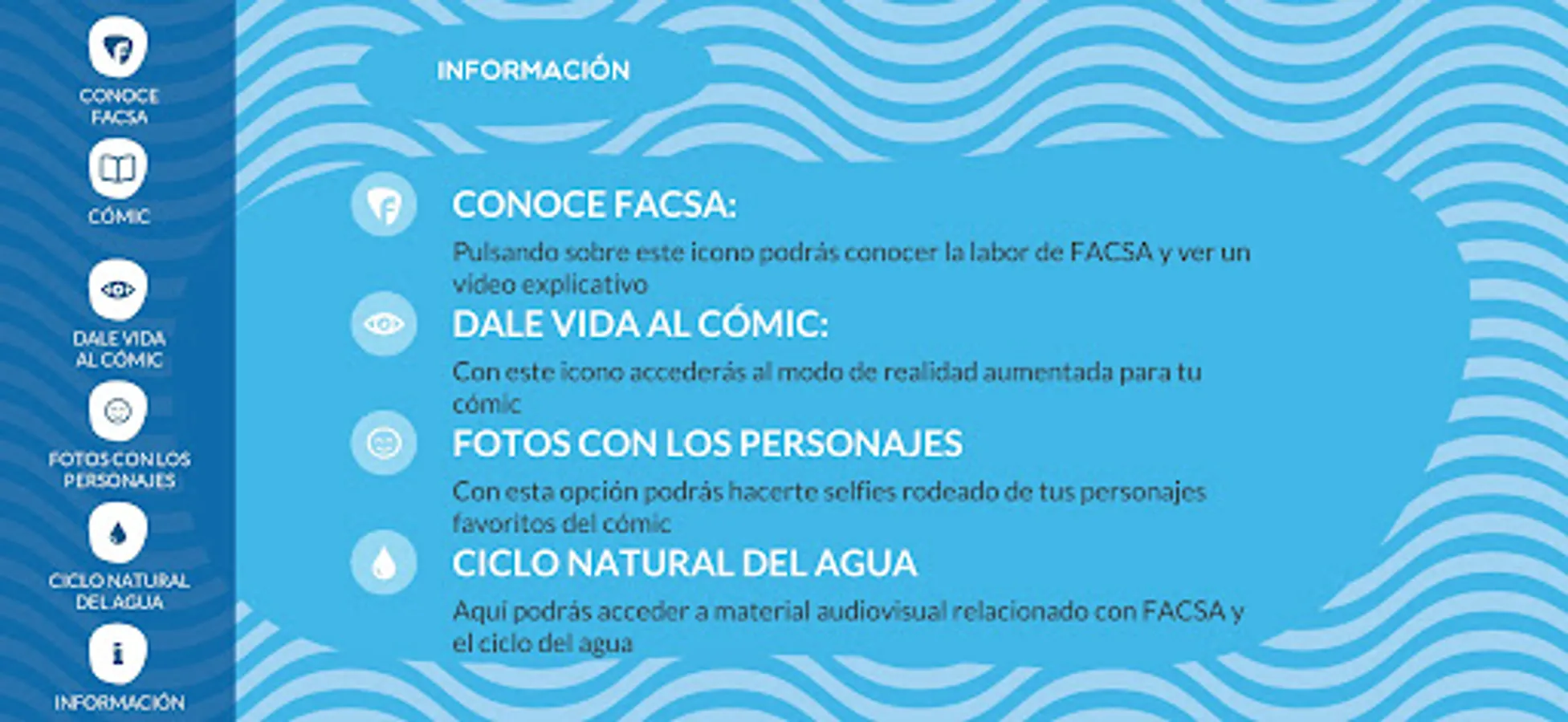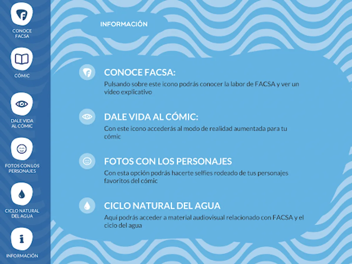 Download the comic "Those who know the most about water", take selfies with all the characters and use Augmented Reality to bring Agüero to life, an expert who will tell you everything he knows about water and with whom you're going to have a great time.