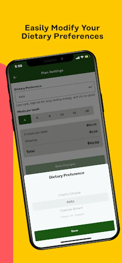 Choose from a variety of dietitian-approved meal plans ranging from 4 to 18 meals per week. Each plan is delivered every week directly to your door, and can be modified in case you're heading out of town for a couple of days, or need extra meals for the weeks when you're just too busy to cook.