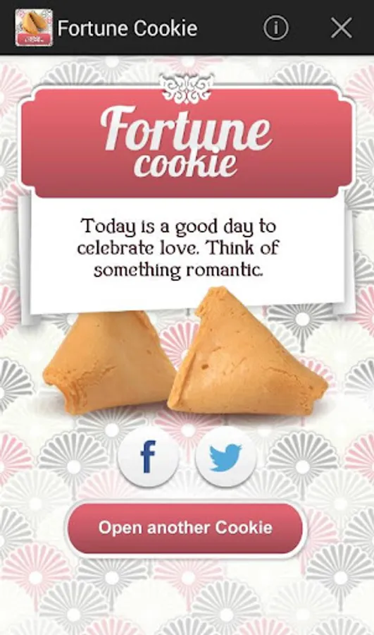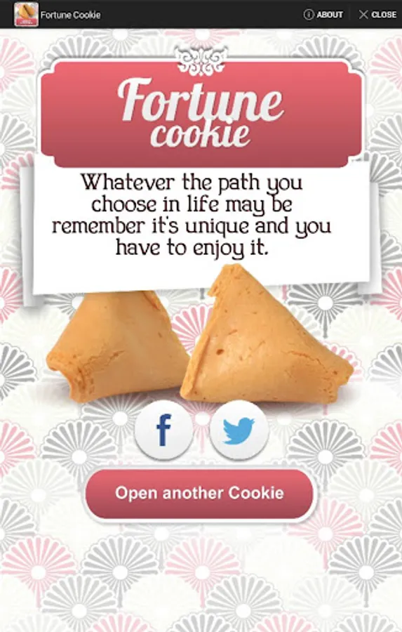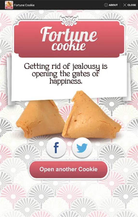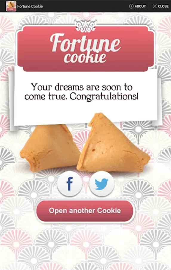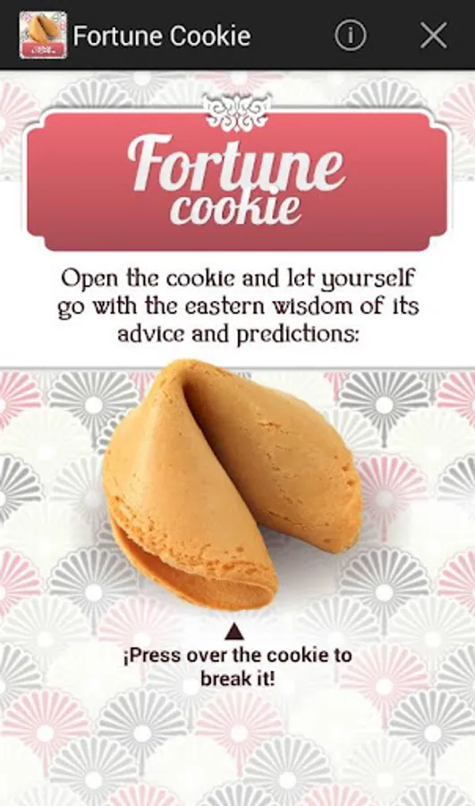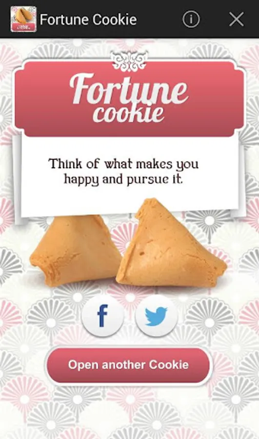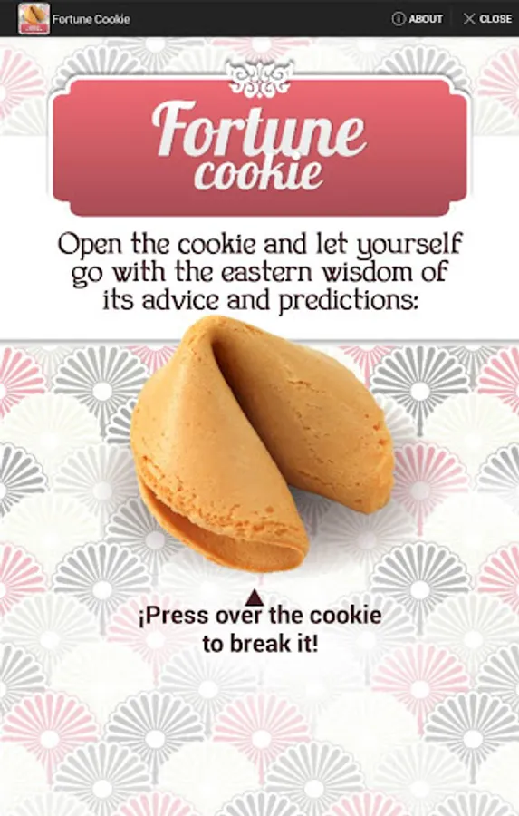 The Fortune Cookie App will accompany you in your day to day so you can enquire after your luck, any time you need so you can take the wiser decision every time. Its ancestral proverbs and its future forecasts will bring you luck, guide you and inspire you. Share in Facebook with your friends!
