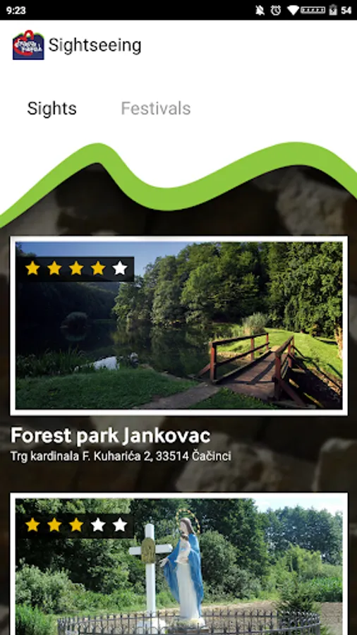 A) Category “Cultural sights” with informations about each tourist attraction, including address, telephone, e-mail address, website. Additionally, this category allows search for the location of the sights on the map, to photograph it and to rate the location.
