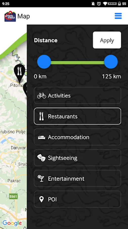 Category Map contains an interactive map with all objects and locations that are offered in the categories of the main menu. Additionally, the map offers ability to filter locations based on themes related to basic categories. The filtering option includes three categories: cultural sights, gastronomic offer and accommodation. Map of county is from the Google Maps service and displays all locations listed in the database with recognizable symbols.
