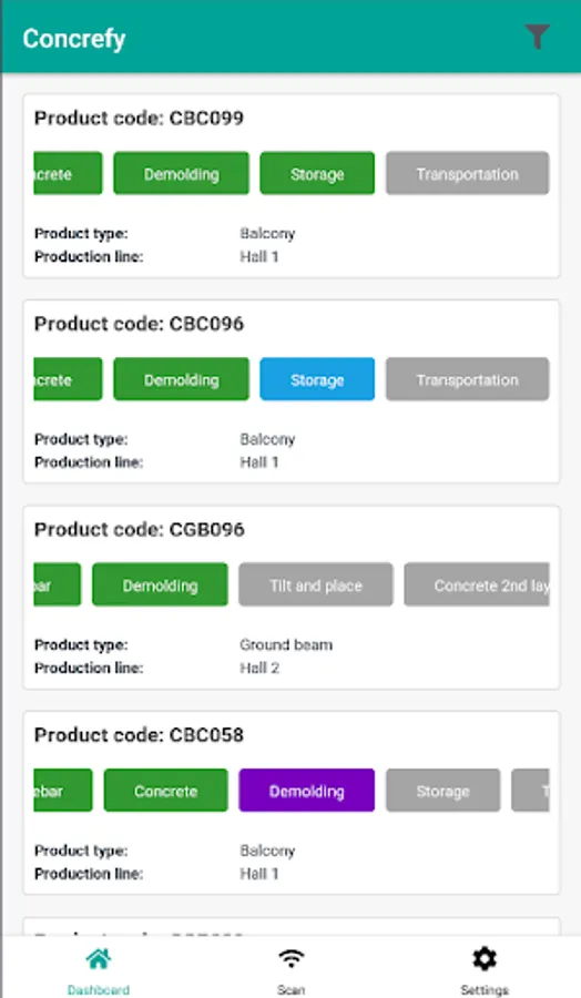 The Concrefy app is an application with which the production control of concrete products is carried out in a smart way. Each step in the production process of a concrete product must be checked and approved before moving on to the next step. With the Concrefy app, these steps are shown per product and the progress is recorded. This digital registration provides insight into the progress of the entire production, both in the app and on the linked website. Employees in production confirm in the app when they have completed a process step. This can be the preparation of the mould, the application of reinforcement, insulation, or the pouring of the concrete. A foreman or production manager who has to check the process steps receives a push message as soon as an element is ready to be checked. In the dashboard page, the products to be checked are marked in color.