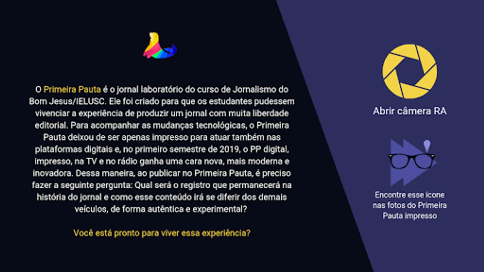 The First Guideline is the laboratory journal of the Journalism course at Ielusc College, located in Joinville, Santa Catarina. It was created so that students could experience the experience of producing a newspaper with editorial freedom. Students write on a variety of subjects, always bringing different perspectives, as well as being their first contact with all the functions of newspaper writing. This is the first Augmented Reality application produced specifically for First Time, issue 145. Enjoy.