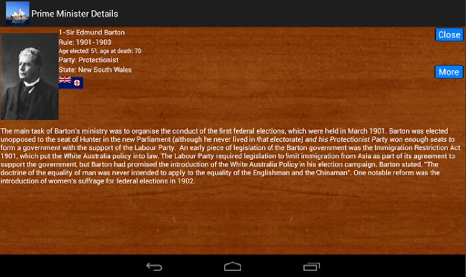 A details view is provided for every prime minister, with a more button to view a more complete profile on the web.