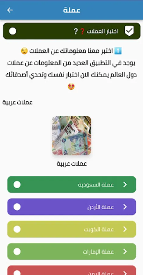 Currency application also contains a game in which you test your knowledge of foreign and Arab currencies