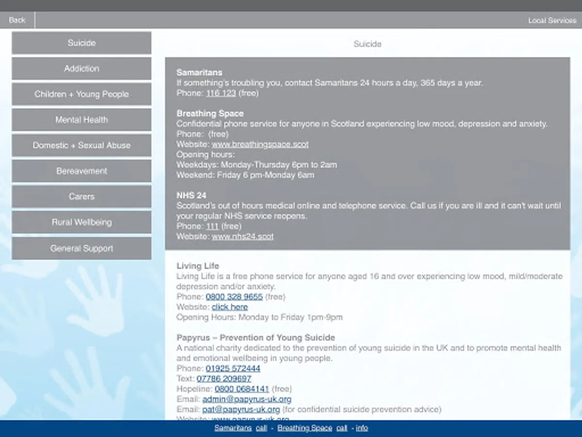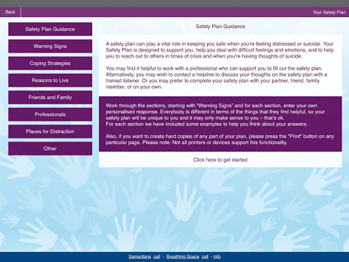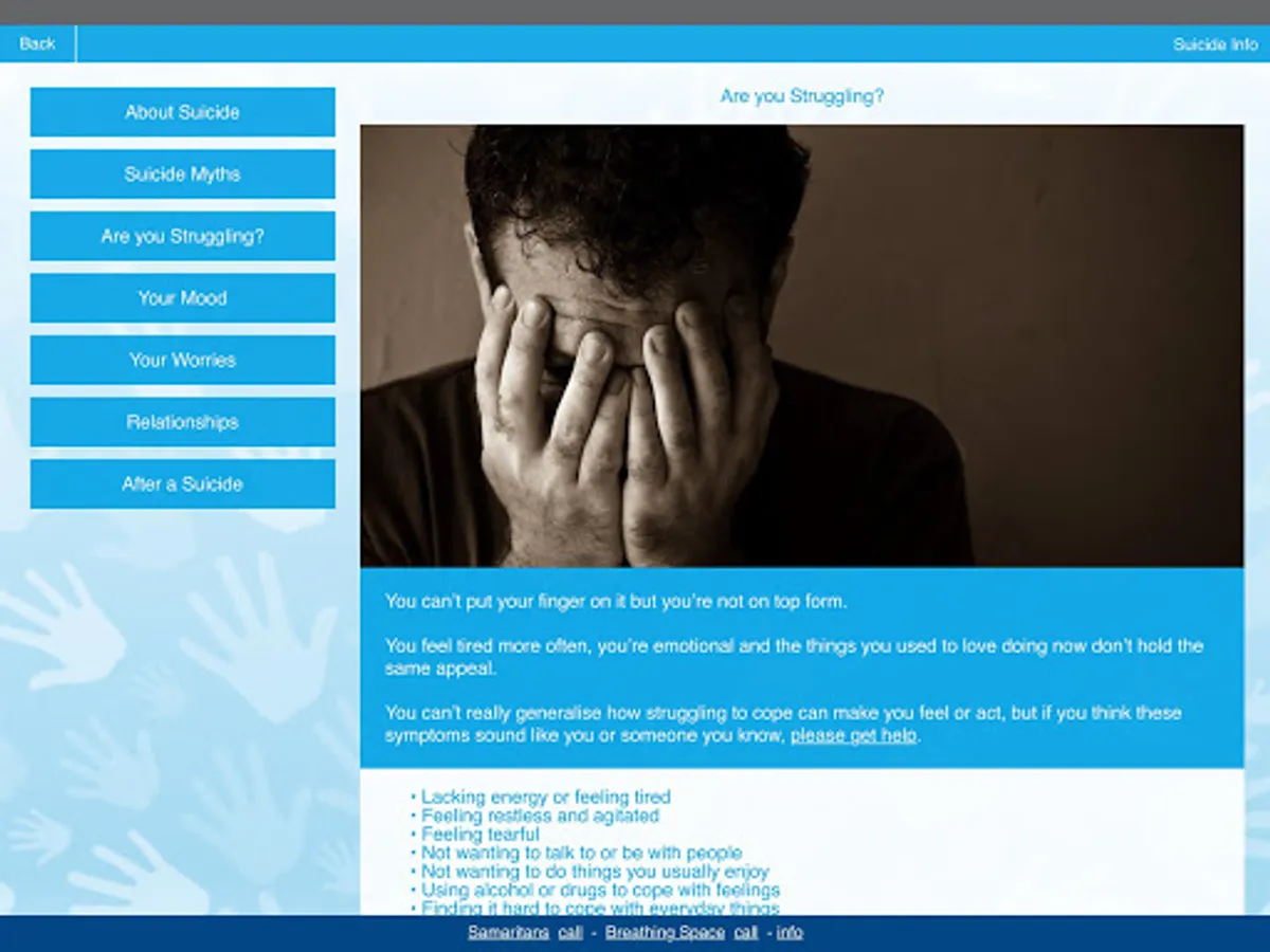It provides helpful info for those affected in any way by suicide, extensive contact details for services in the area as well as providing users with the ability to create their own safety plan.