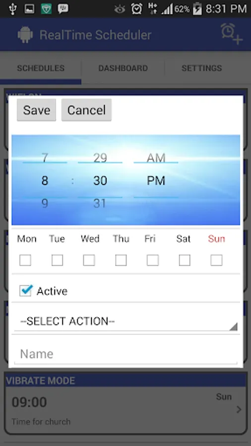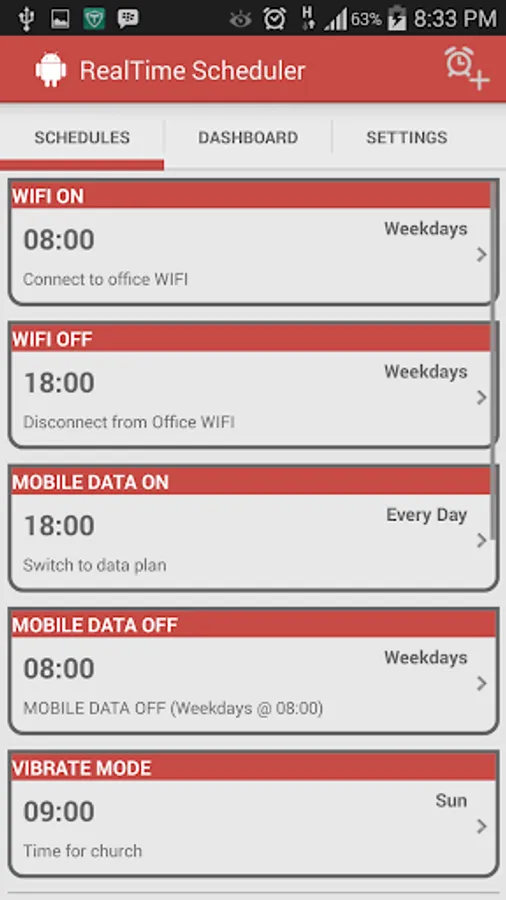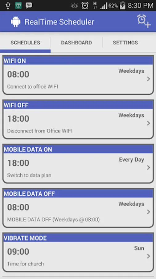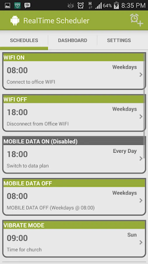 RealTime Scheduler runs in the background, taking care of all your scheduled phone actions/tasks for the day. There is also the option of pausing all schedules(Vacation Mode), allowing you to temporarily suspend execution of all or a specific task. .